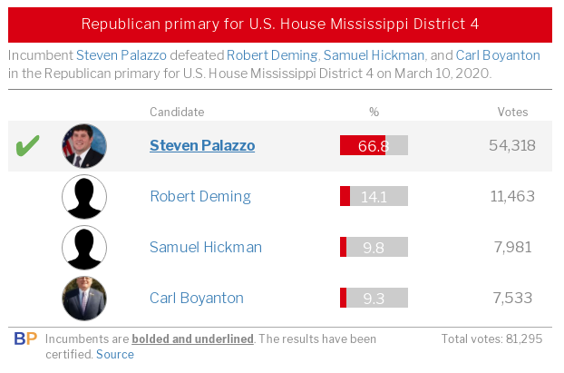 Well, Democrats did not run because Palazzo's seat is gerrymandered to be safe for Republicans. So how about an independent challenger (like someone who voted to change the flag)? 3/