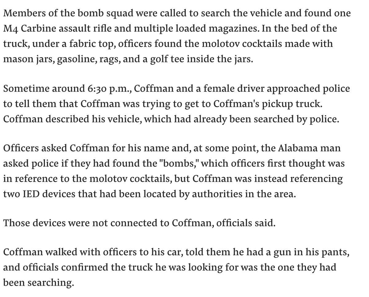 Lonnie Coffman, AL, was arrested after identifying his car to officers, who, unbeknownst to him, had already searched it. It allegedly contained 11 Molotov cocktails w/ homemade napalm, 2 handguns, and an M4 assault rifle. @SalHernandez w the deets: buzzfeednews.com/article/salvad…