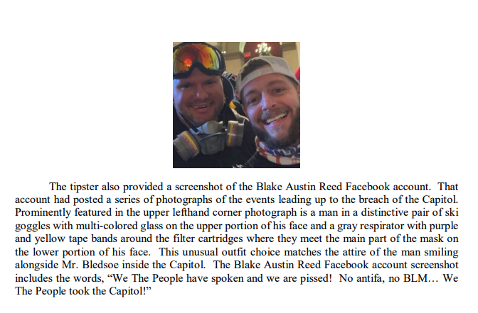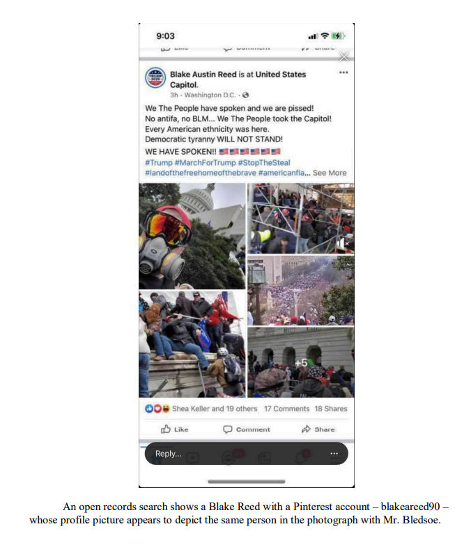 At it again! Starting with Blake Austin Reed, 35, TN, arrested after he outed himself on Facebook and Pinterest for storming the capitol. He currently has an ankle monitor, his lawyer said in court. From the FBI file: