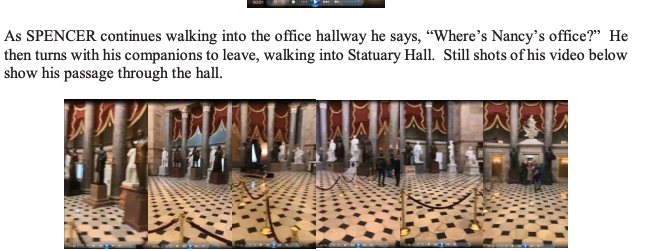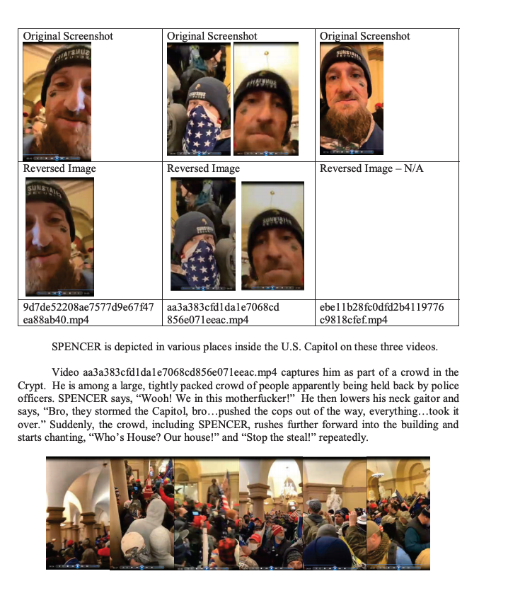 Next is Christopher Raphael Spencer, 40, NC. He was arrested after being IDed in a video of him in the Capitol asking where Pelosi's office is and saying "Wooh! We in this motherfucker!" the FBI doc says. He is released pending his next hearing and told to surrender any firearms