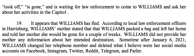 The gov lawyer is being tight-lipped because she is concerned that giving too many details about the investigation could jeopardize it, but she says that Riley Williams deleted her accounts *before* she turned herself in, and instructed others to delete evidence.