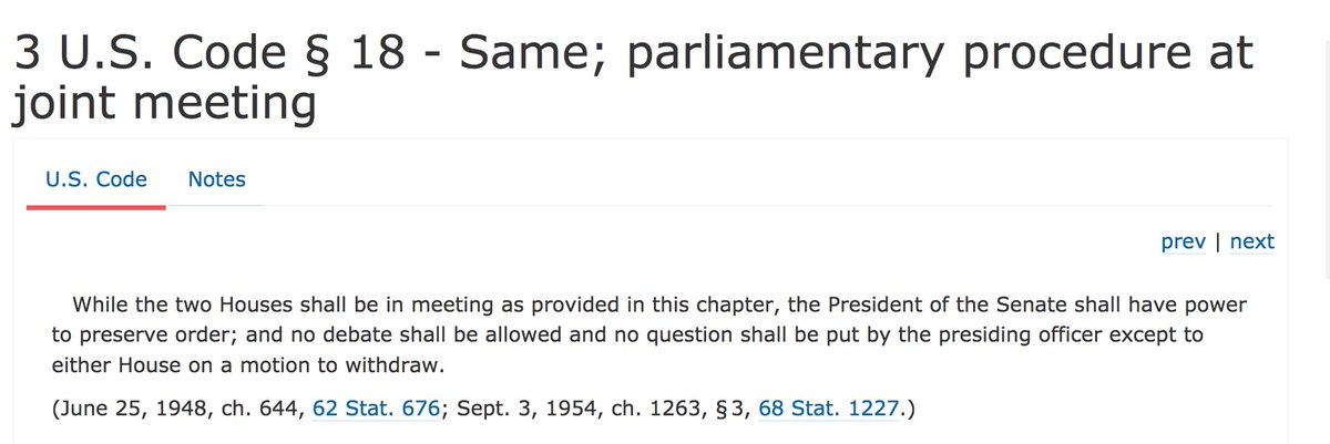 @uscapitol@cspan@SpeakerPelosi "Respectfully, the gentleman's parliamentary inquiry constitutes debate, which is not permitted in the Joint Session under Section 18 of Title III, US Code."-@VP@Mike_Pence law.cornell.edu/uscode/text/3/…
