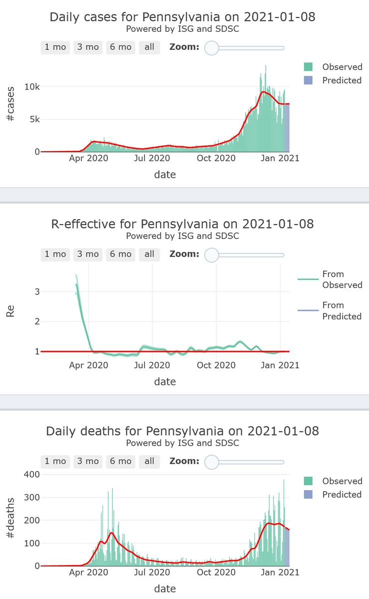 5/10 - Pennsylvania will be plateauing at high levels of its #COVID19 epidemic activity (R-eff=0.99), with alarming levels of mortality, for 7 more days.