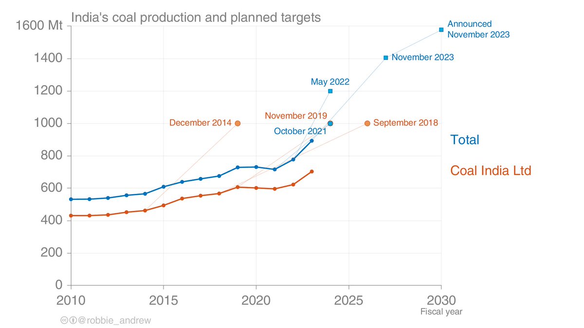 India's Ministry of Coal announced new production targets yesterday: 1404 Mt by 2027 and 1577 Mt by 2030.