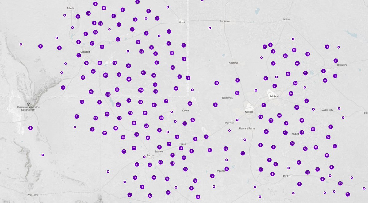 There are a lot of sources in Texas and New Mexico. Zoom in to see them in groups, zoom in further to see individual sources. 2/3