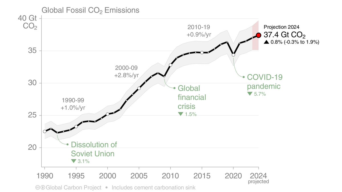 📢Today the Global Carbon Project releases its 2024 edition of the Global Carbon Budget, a comprehensive assessment of our perturbation of the carbon cycle and the balance of sources and sinks of CO₂. 1/🧵