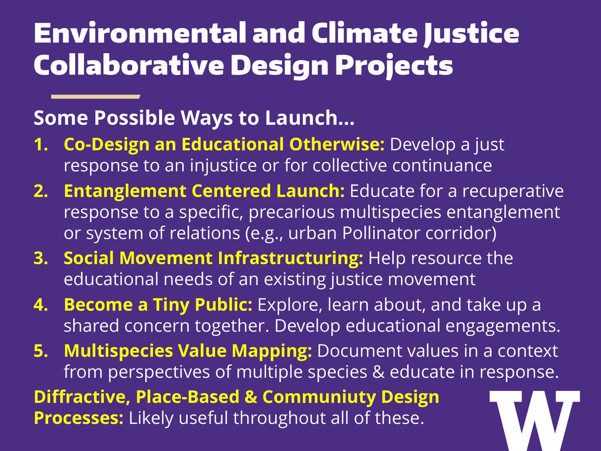 In Session 7 of #UWClimateEd, we launched into our co-design project groups. We discussed these project criteria. I then shared strategies I've been developing for launching into mutlispecies flourishing work from an equity stance. Then we got into the nitty-gritty project work!