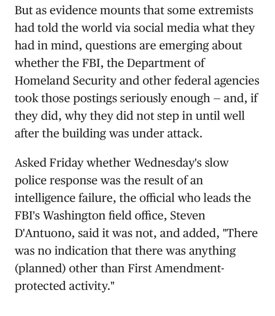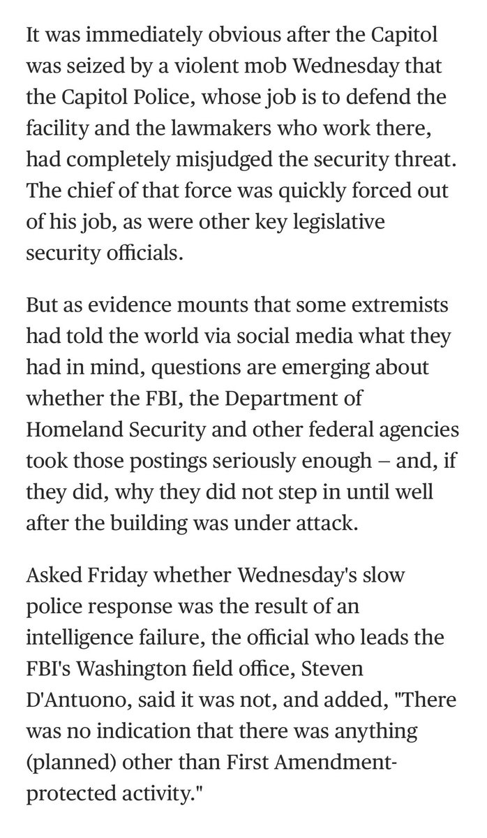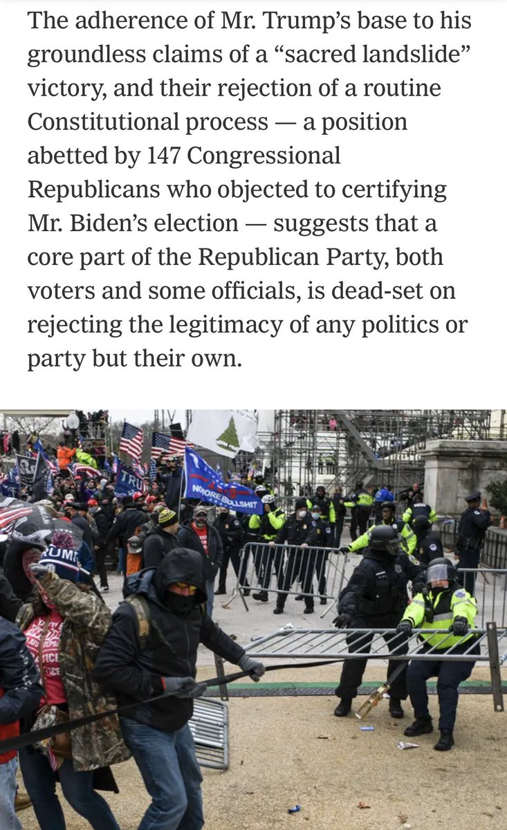 “It is not clear whether any elected officials played a role in directly facilitating the attack on the @uscapitol, other than helping to incite [seditious mob] violence through [lying] about the election being stolen from [@POTUS45 in speeches & tweets].” nytimes.com/2021/01/29/us/…