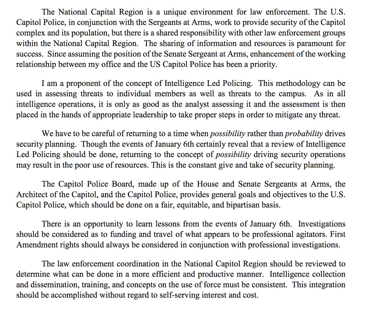 In his written testimony, Michael C. Stenger, former Senate Sergeant at Arms, said "the events of January 6th certainly reveal that a review of Intelligence Led Policing should be done," but had (notably) less to say about its failures rules.senate.gov/imo/media/doc/…
