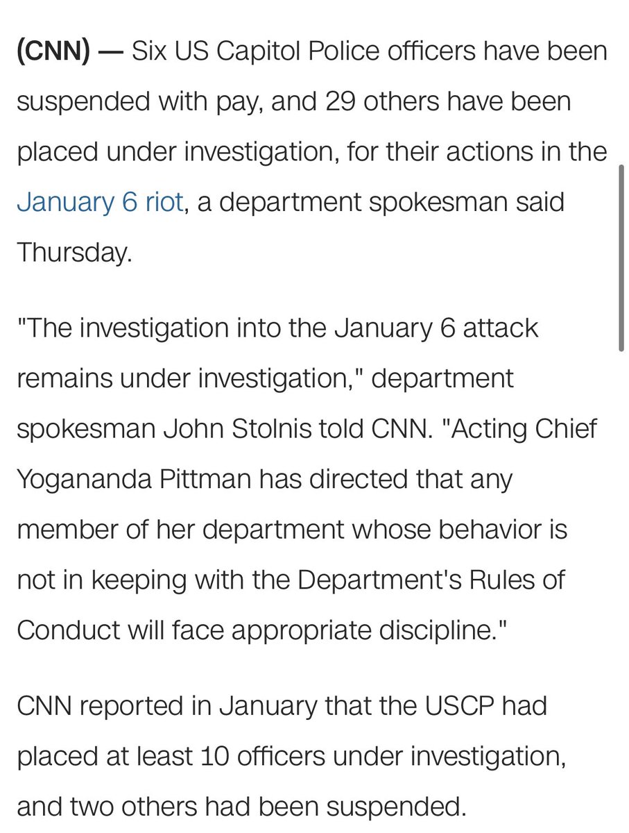 CNN: “6 US Capitol Police officers have been suspended with pay, and 29 others have been placed under investigation, for their actions in the January 6 riot.” cnn.com/2021/02/18/pol…