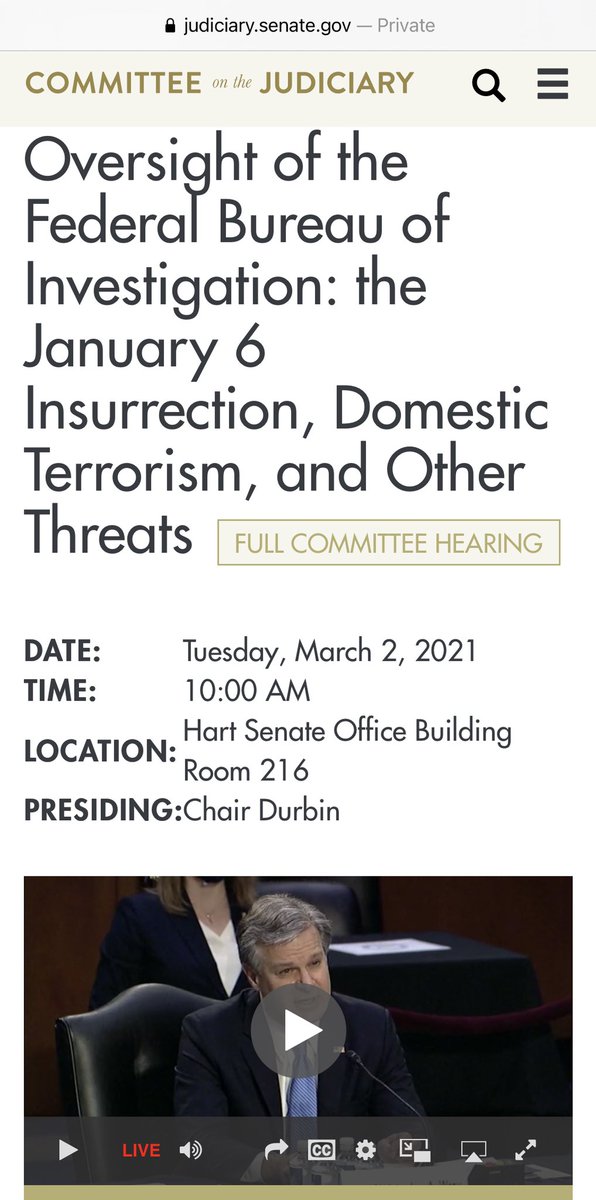 For the 1st time, Americans are hearing testimony from @FBI Director Wray about the January 6 insurrection & domestic terrorism threats. Watch online: judiciary.senate.gov/meetings/overs… & on @cspan 3.