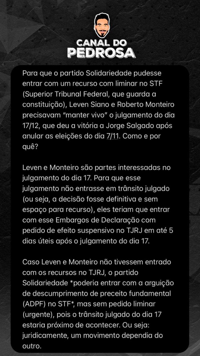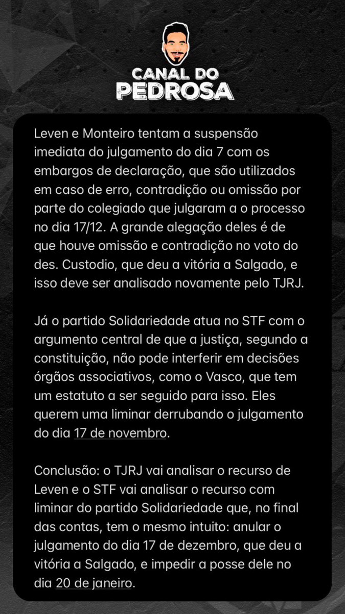 Enquanto não houver um julgamento definitivo, não há decisão final sobre quem será o novo presidente do Vasco. Leven está “ganhando a guerra”. Em instantes, dias ou semanas pode ser o Mussa, que entra com o agravo interno para a reconsideração que expliquei no outro tweet.