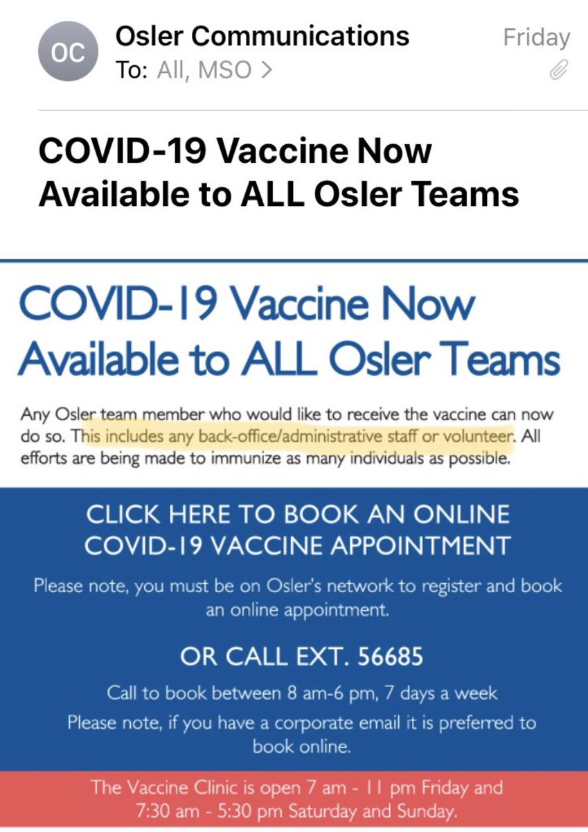 Many frontline healthcare workers, including those that work directly with #COVID19 patients, still have no idea when they will get their #CovidVaccine (especially in rural areas or outside of hospital system). But non-clinical staff @UHN are being offered vaccines?!