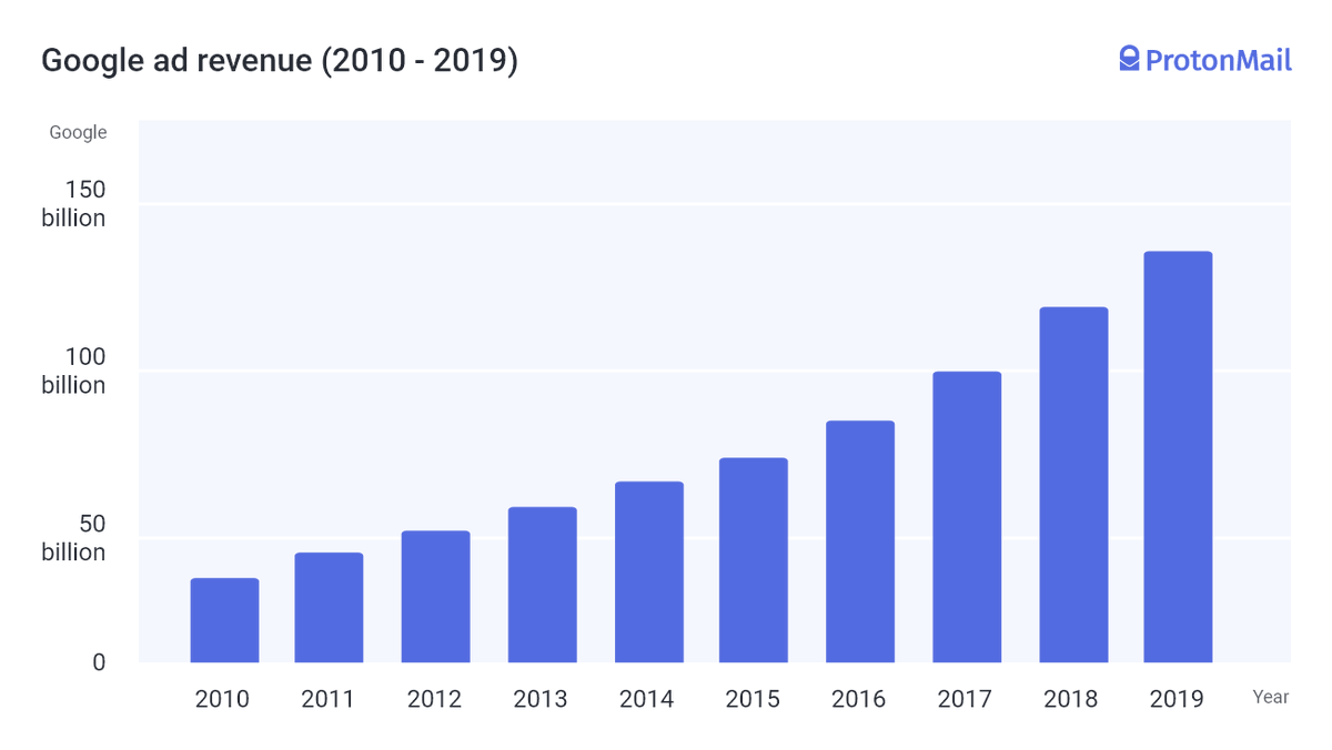 ProtonMail'in yaptığı araştırmaya göre, Facebook’un reklam geliri 2010 yılından 2020 yılı son çeyreğine dek %3,600 arttı, ancak aynı dönemde kullanıcı sayısı yalnızca %310 artış gösterdi! Bu, Facebook'un kullanıcı başına 27$ kazanması demekti! (2019)