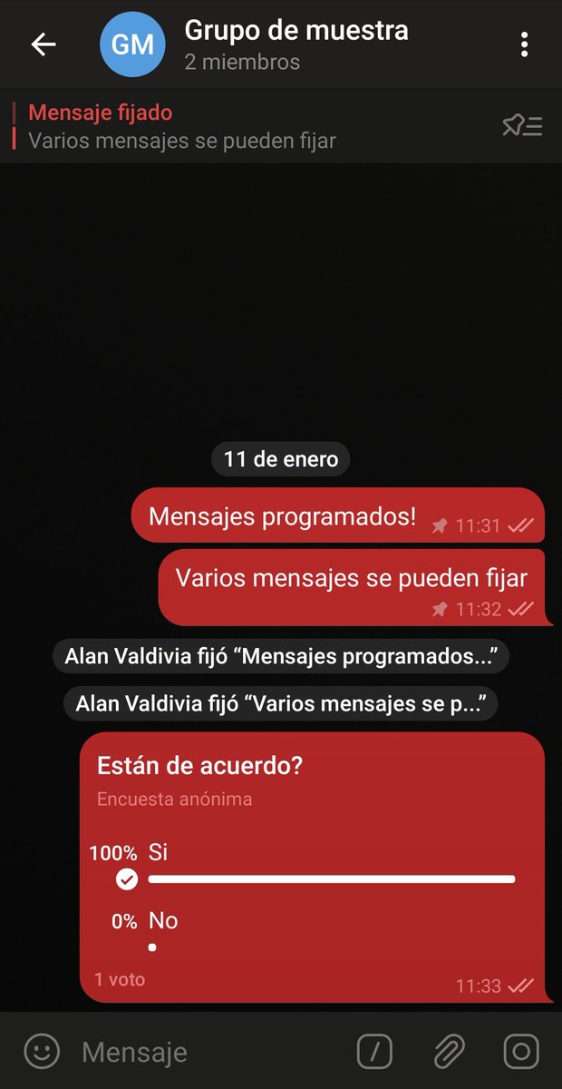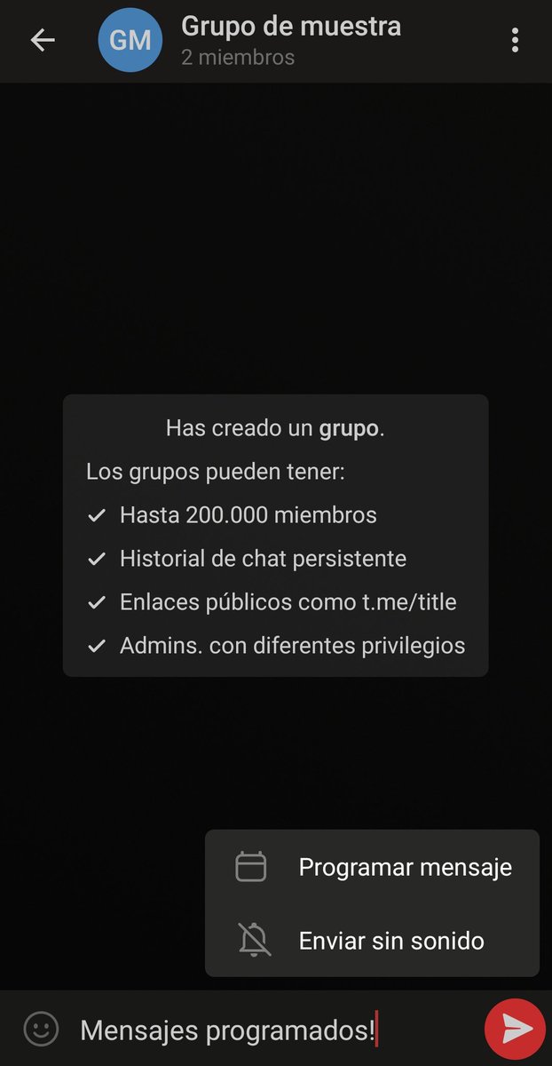 Se pueden programar mensajes, tanto en grupos como en chats privados, y los grupos tienen esas ventajas.