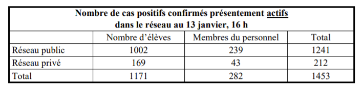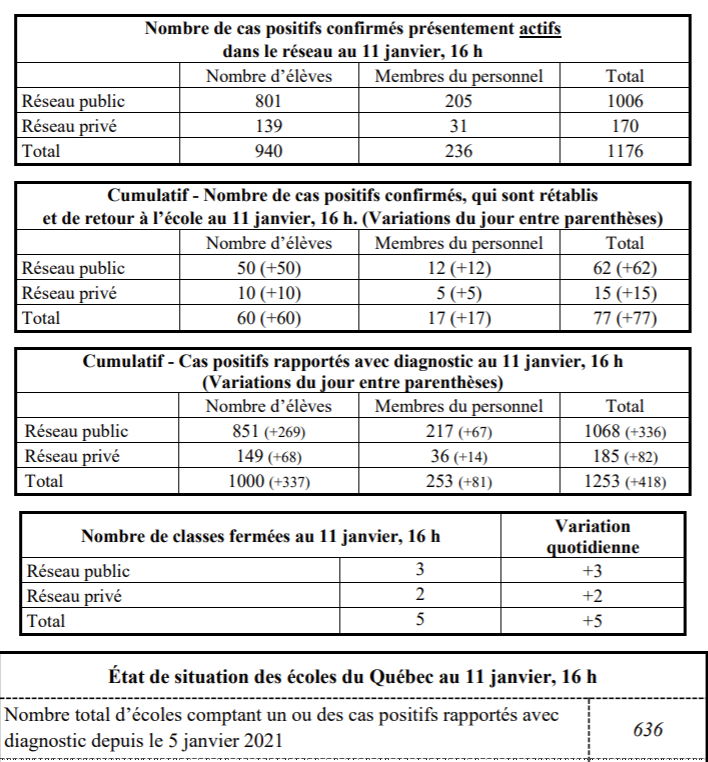 Quebec reports 835 active school cases as of Friday, before primary schools reopened. As of last Monday, the first day of online school, it was 90.