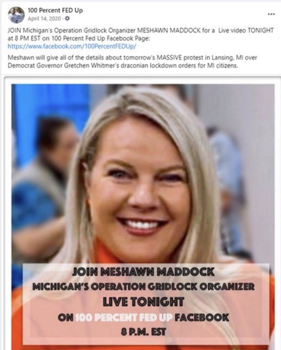 Meshawn Maddock organized the protest at the Michigan State Capitol which was overtaken by terrorists with long guns. At this protest there was a doll hanging from a noose that was supposed to be Governor Whitmer.