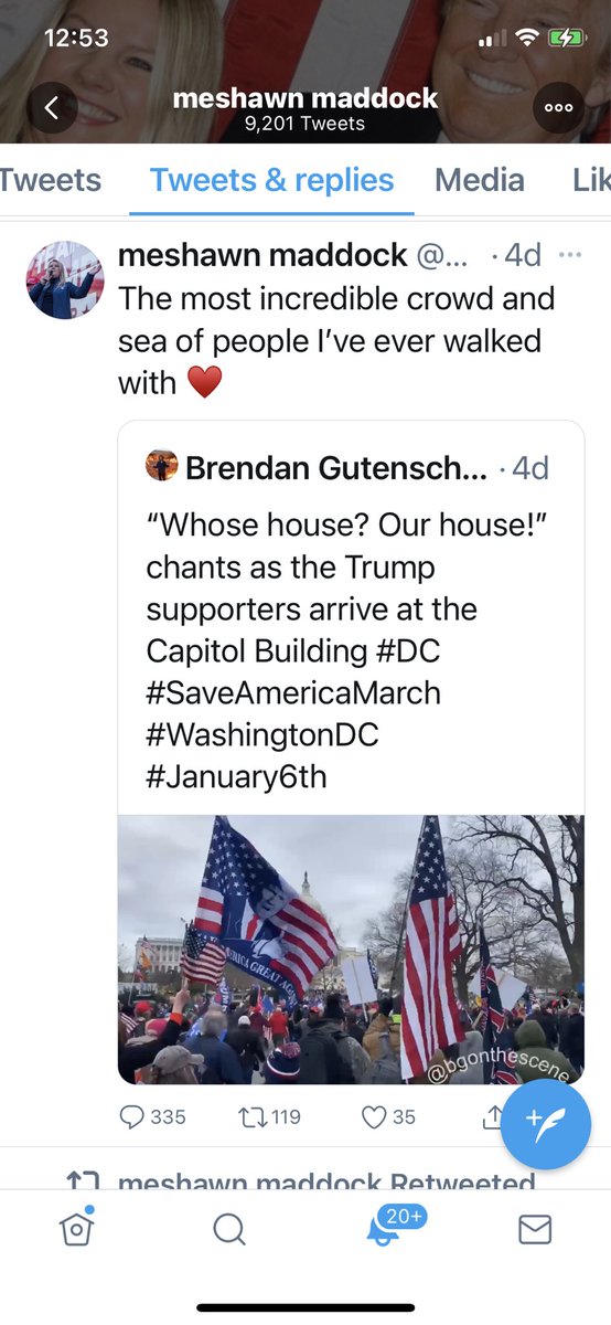 Meshawn and Matt Maddock participated in the Capitol Insurrection. If you have any other pics or information on the Maddocks, and their funding, please share them on this thread. Real America thanks you! 🇺🇸🇺🇸🇺🇸