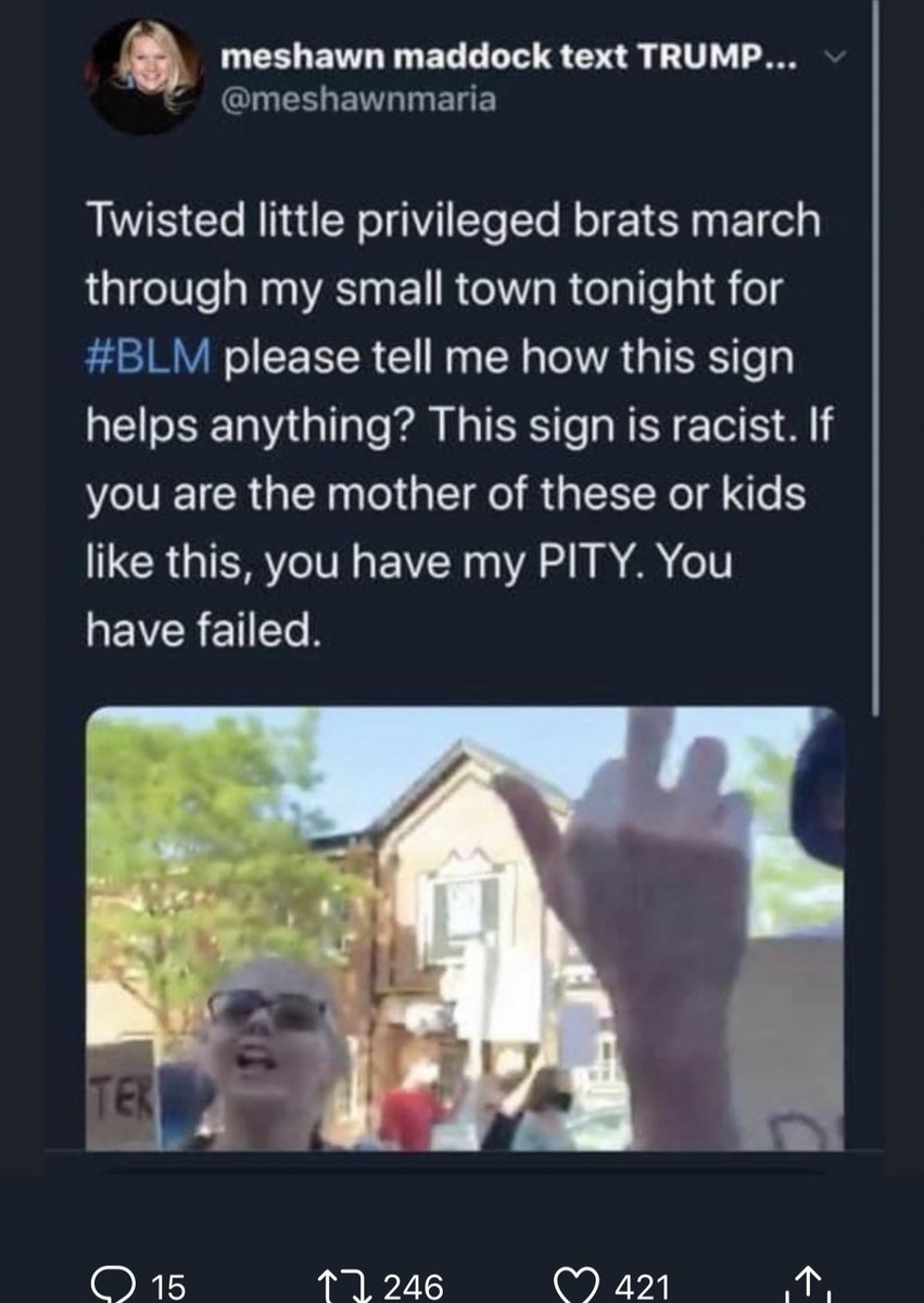 Here is Meshawn Maddock giving a thumbs down at a BLM parade. No mask. In a video on FB she yells “get a job”.