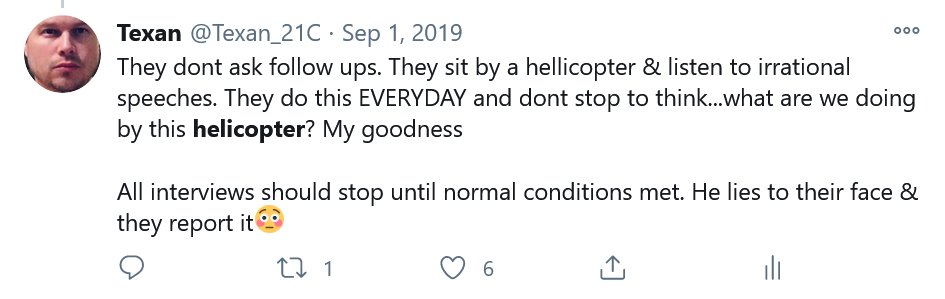 & hes doing what he always does: Standing by helicopter & giving propaganda speech. He's playing them like a fiddle. They ask timid question👉🏼Trump lies