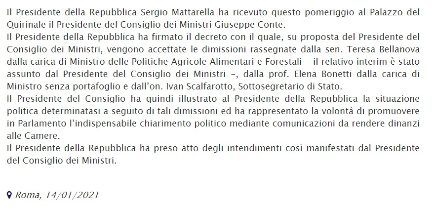 🇮🇹 El Primer Ministro Giuseppe Conte se someterá a una votación en el parlamento y en el senado, donde necesita el apoyo de 13 senadores, para mantenerse en el cargo. El Presidente de la República le ha concedido esta prórroga tras reunirse con él en el Palacio del Quirinale.