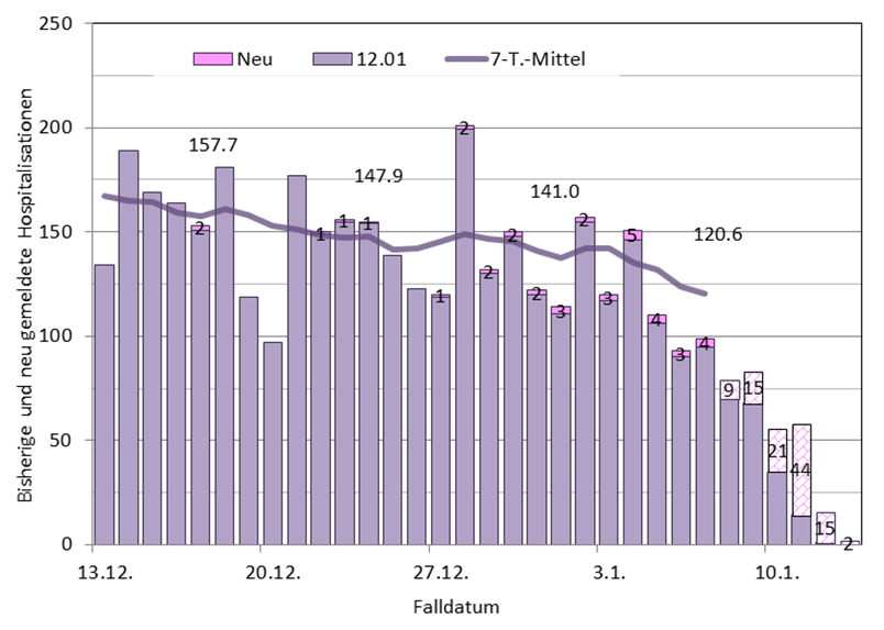 Spitaleintritte u. Hospitalisationsrate leicht abnehm., es ist mit Nachm. zu rechnen