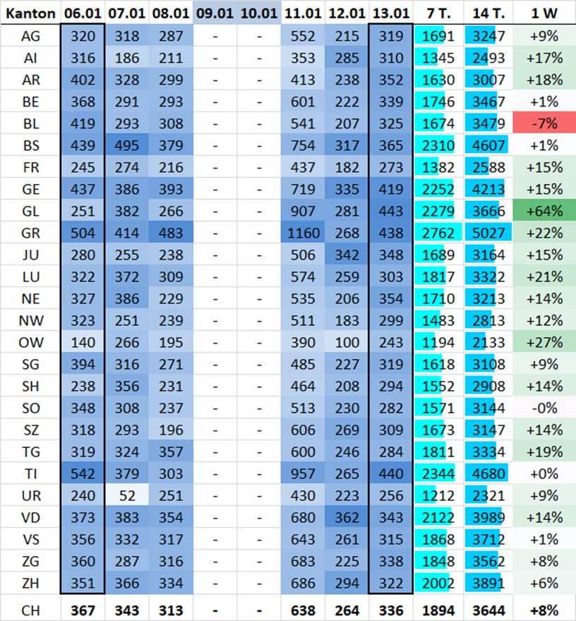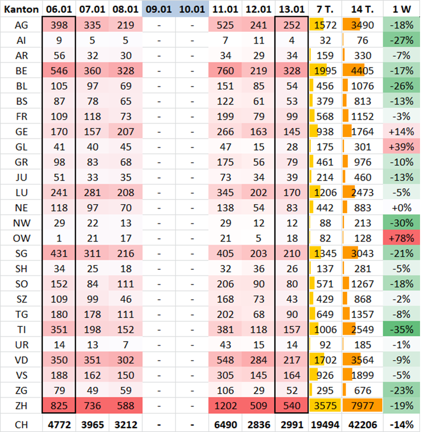 Die Fallzahl ist tiefer als an den letzten zwei Do, wo 4'391 und 3'975 gemeldet wurden.