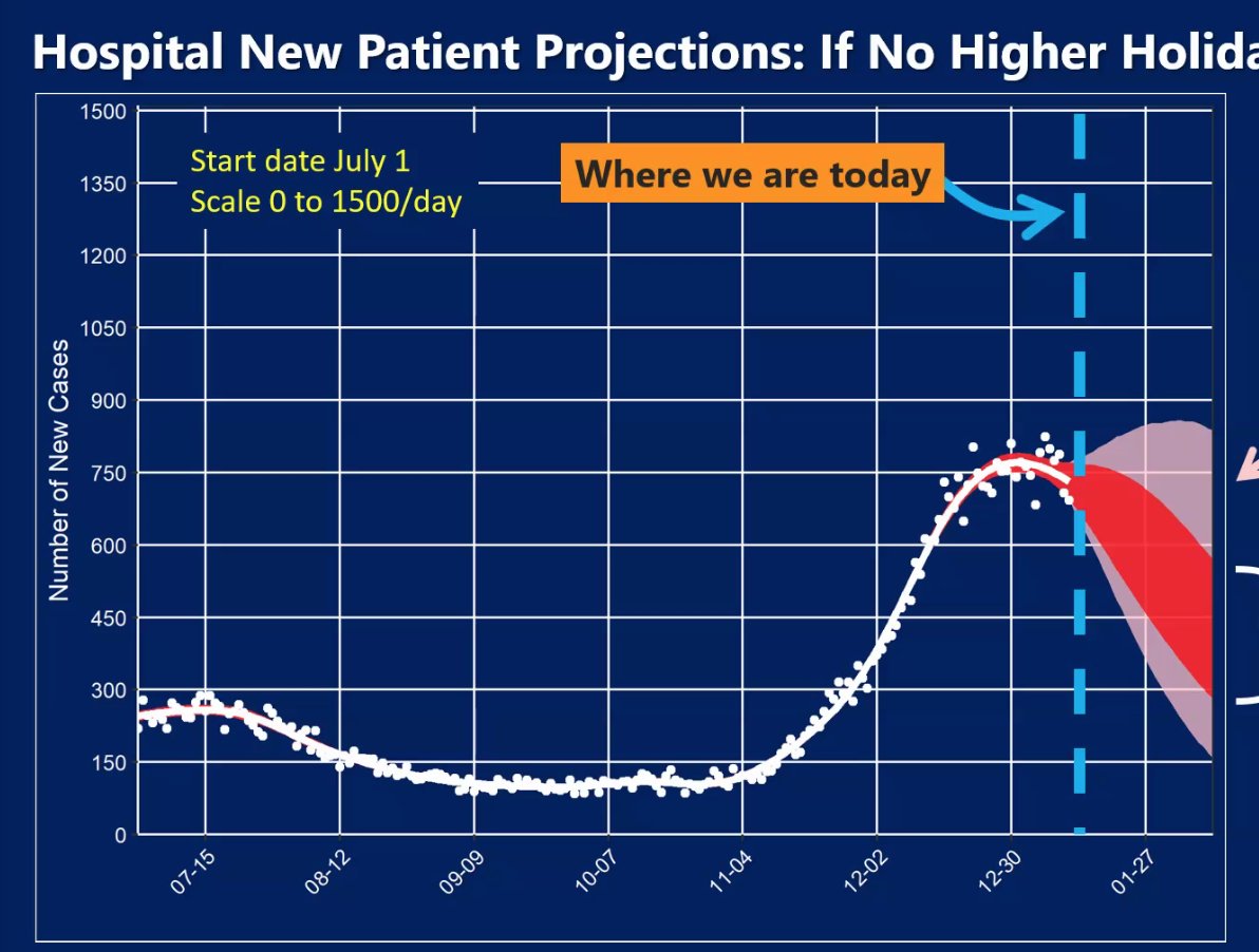 There has been a slight decline in the number of patients being admitted to the hospital with COVID each day in LA County. This is good, because hopefully hospitals will be less crowded when the Christmas/NYE hospital surge hits, as is expected.