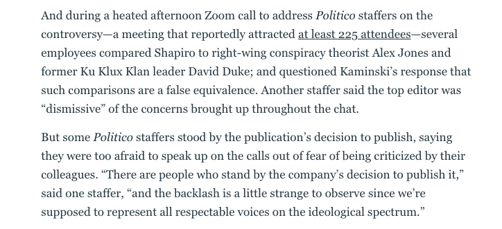 On the editorial call, staff reaction to Shapiro's Playbook authorship was overwhelmingly negative. Some compared Shapiro to Alex Jones, and said Kaminski was dismissive of concerns. But a few staffers reached out to me to defend the decision (anonymously) thedailybeast.com/politico-faces…