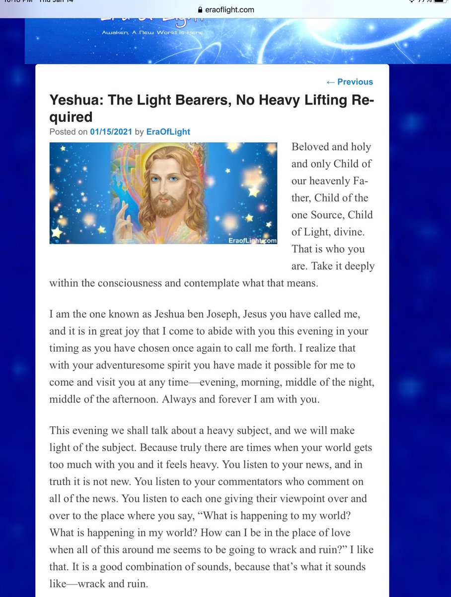 to abide in peace and in inspiration that comes from peace. Allow yourself to look around to see where you can spread peace; with neighbors, with friends. When they are upset about something, spread peace.” Full post eraoflight.com/2021/01/15/yes…