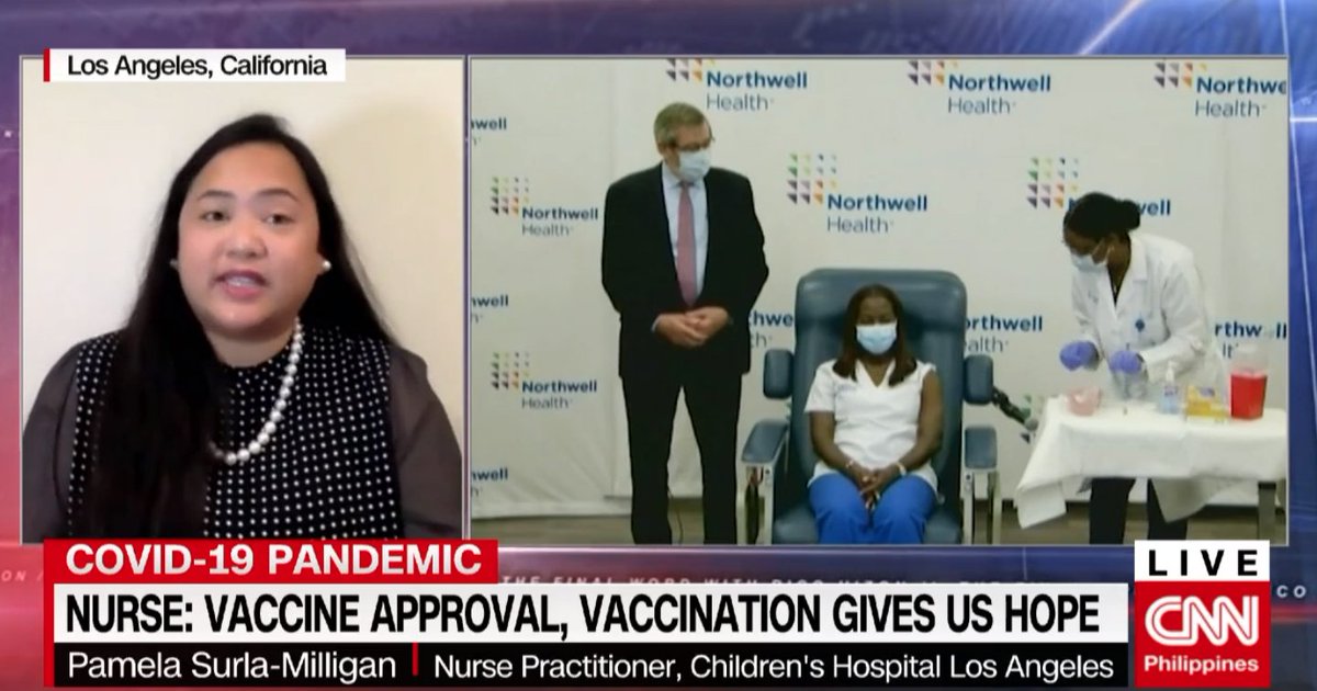 Los Angeles-based Filipino nurse Pamela Surla-Milligan: I got my immunization in the 2nd week of December. I only felt a bit soreness in my arms after I received the first dose of the vaccine.
