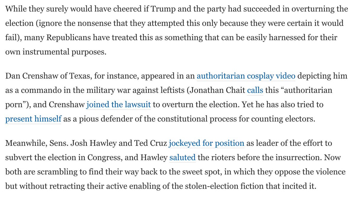 Conor Lamb's powerful rebuke of the Sedition Caucus stands as an important statement about this dangerous moment. He laid bare an essential truth: The core ethos of this movement is that it does not feel bound by *legitimate* electoral outcomes. My latest: washingtonpost.com/opinions/2021/…