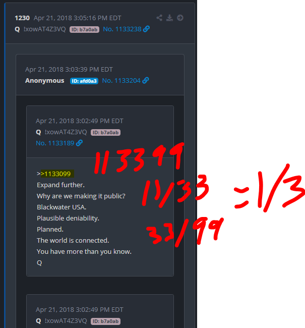 1230 is the next stop. I'll point out the 1133099. 11/33, 33/99 =1/3. Notice that date? Dropped by ten? (Not observing the (Apr. +3mnth -9mnths from current) Is the ratio linked? Repeats on the drop? Dunno.