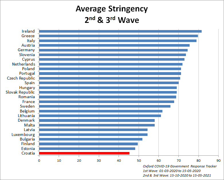 In the 2nd wave Croatia made a unique move in switching from very stringent to very liberal measures. This chart show differences in stringency for all EU countries: