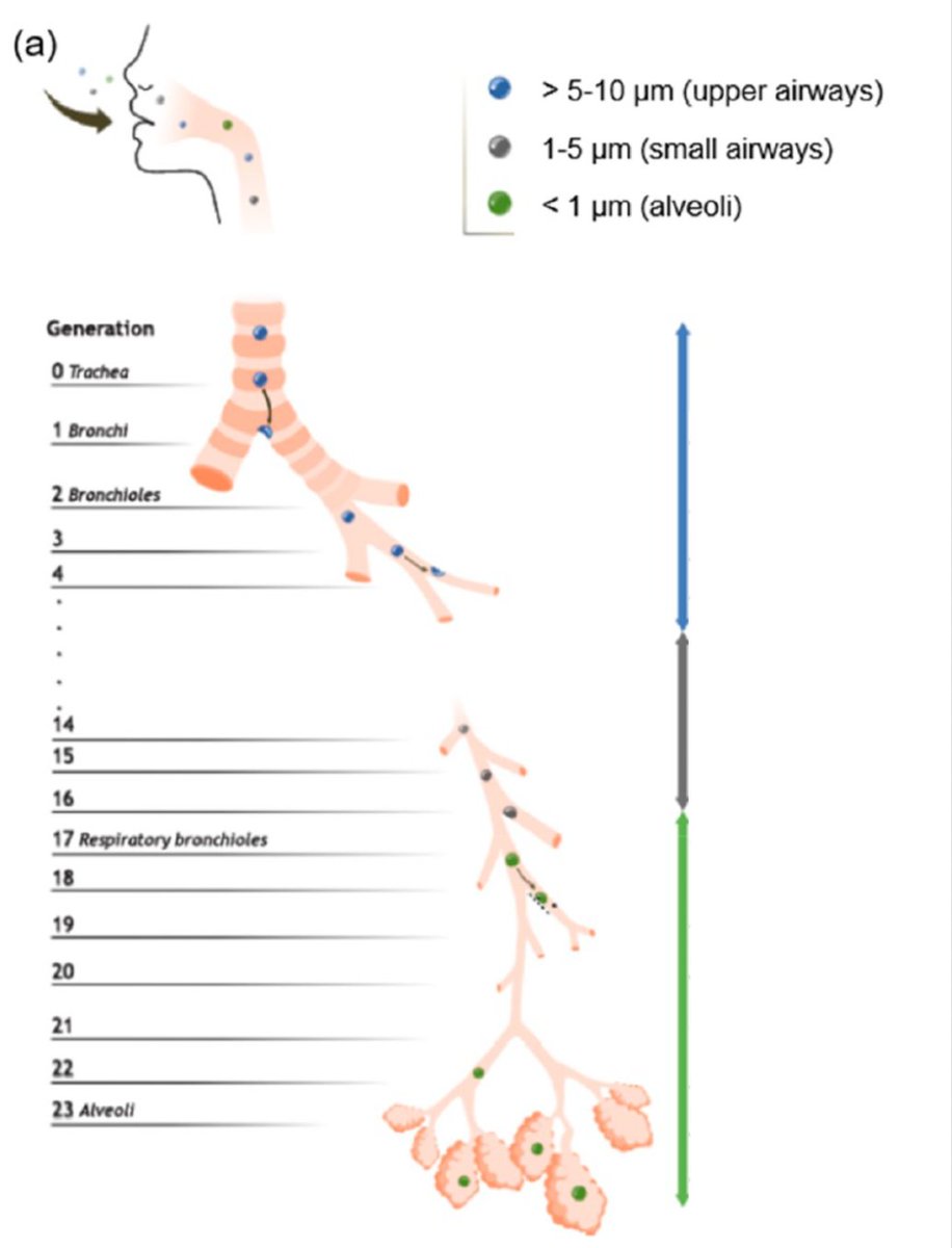 6/In humans, larger aerosols deposit in upper throat, nose, & tracheobronchial region of the lung. Medium-sized aerosols mostly deposit in small airways further down. The really small aerosols <1 μm can penetrate all the way to the alveoli - the basic units for gas exchange. 6/8
