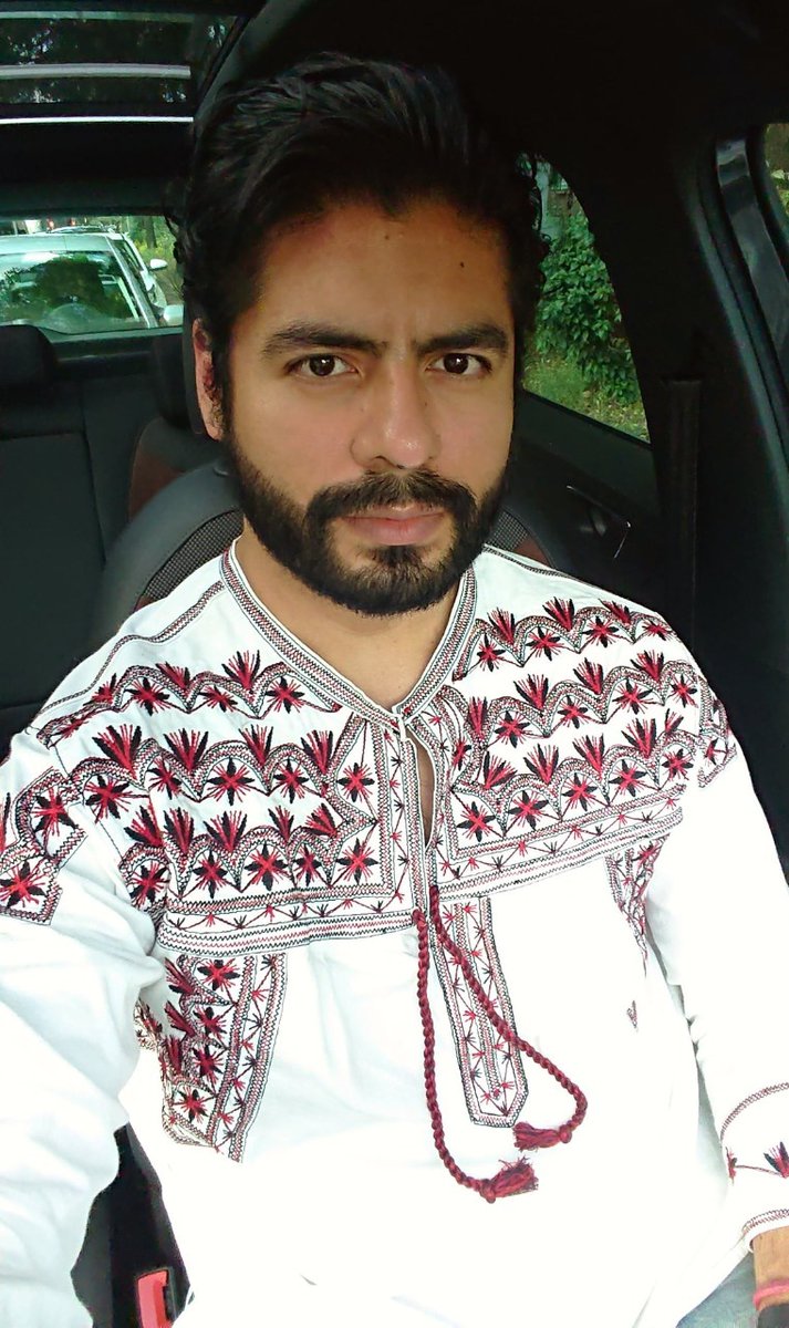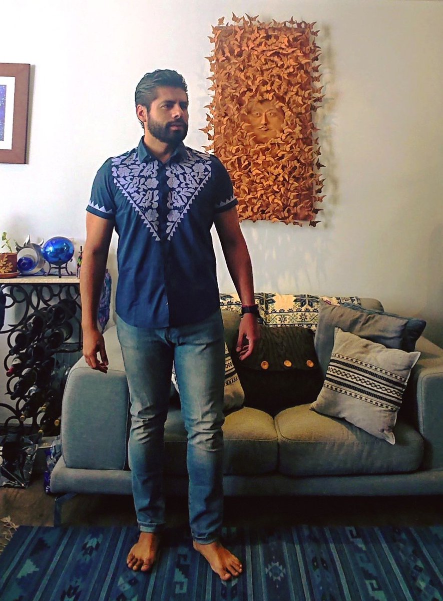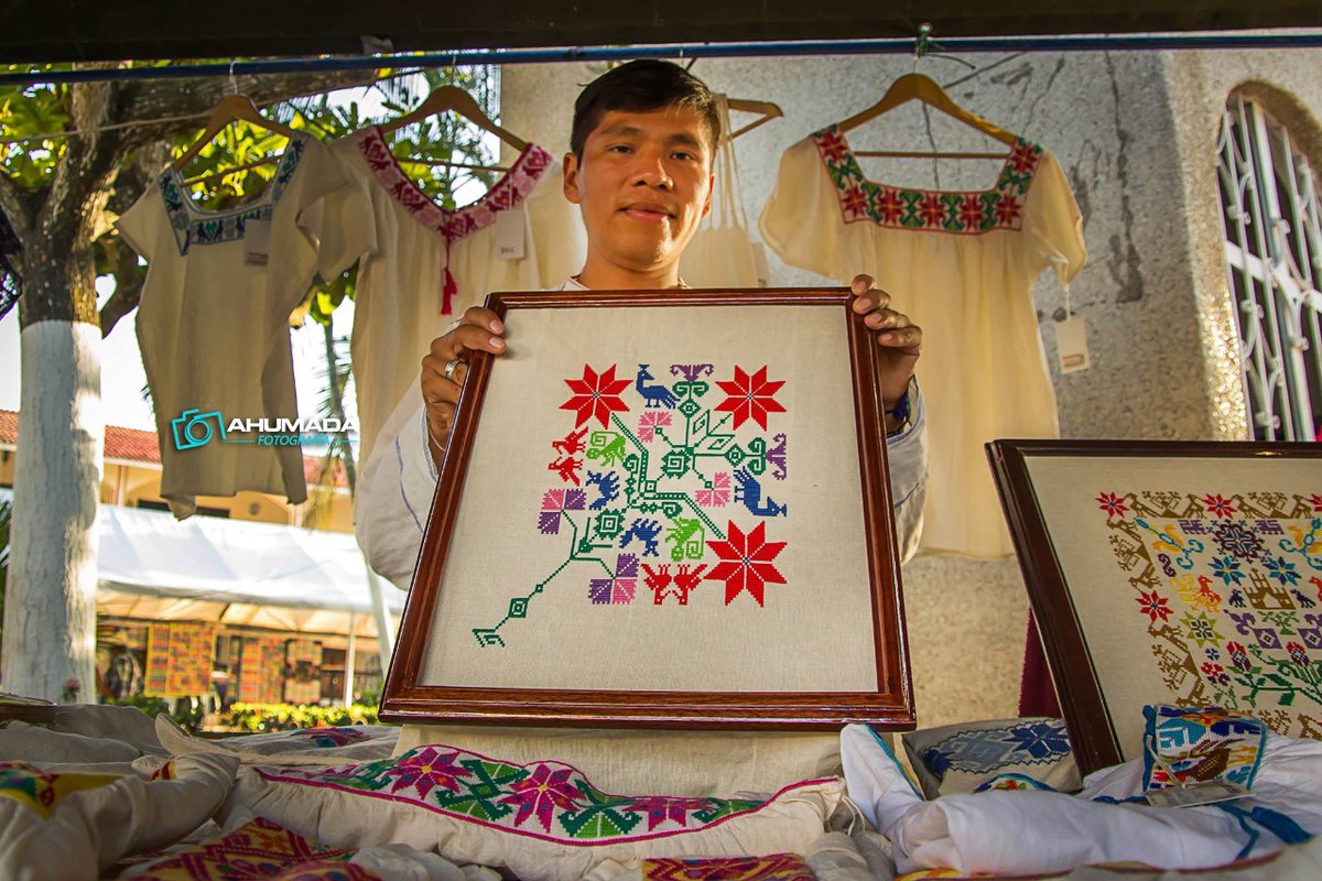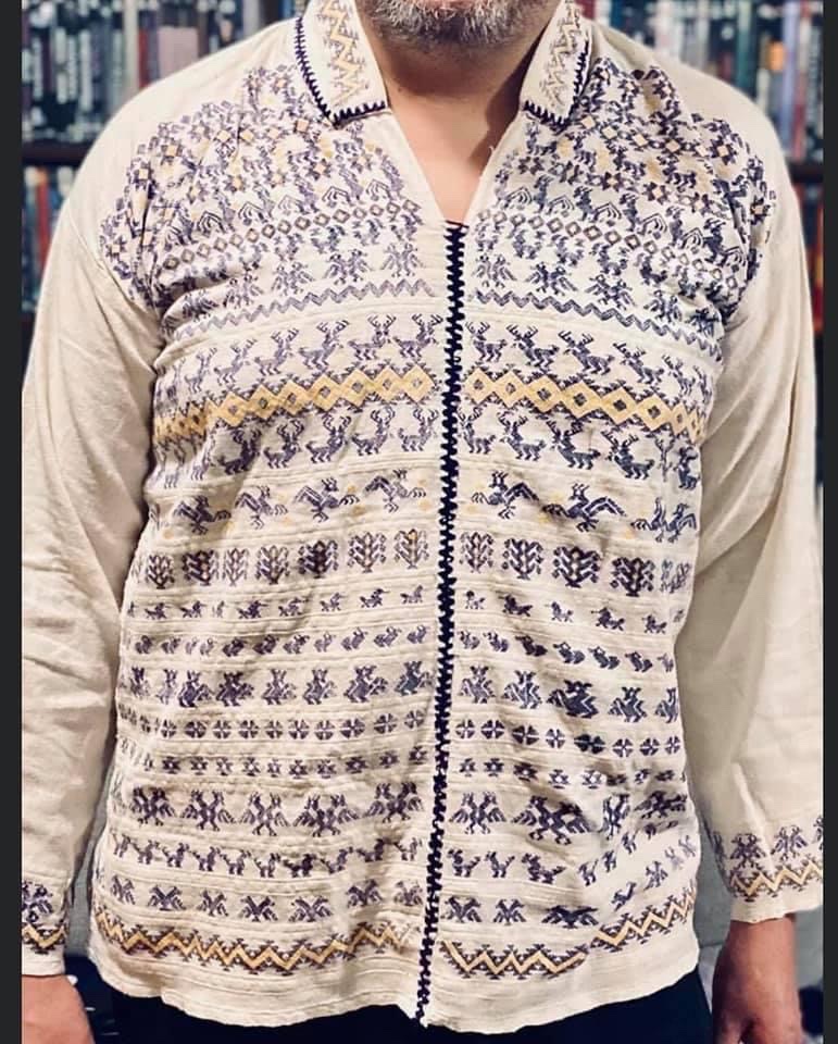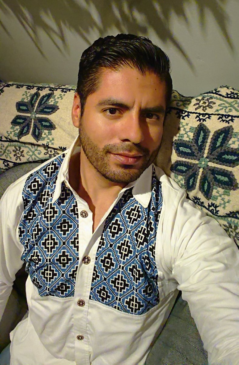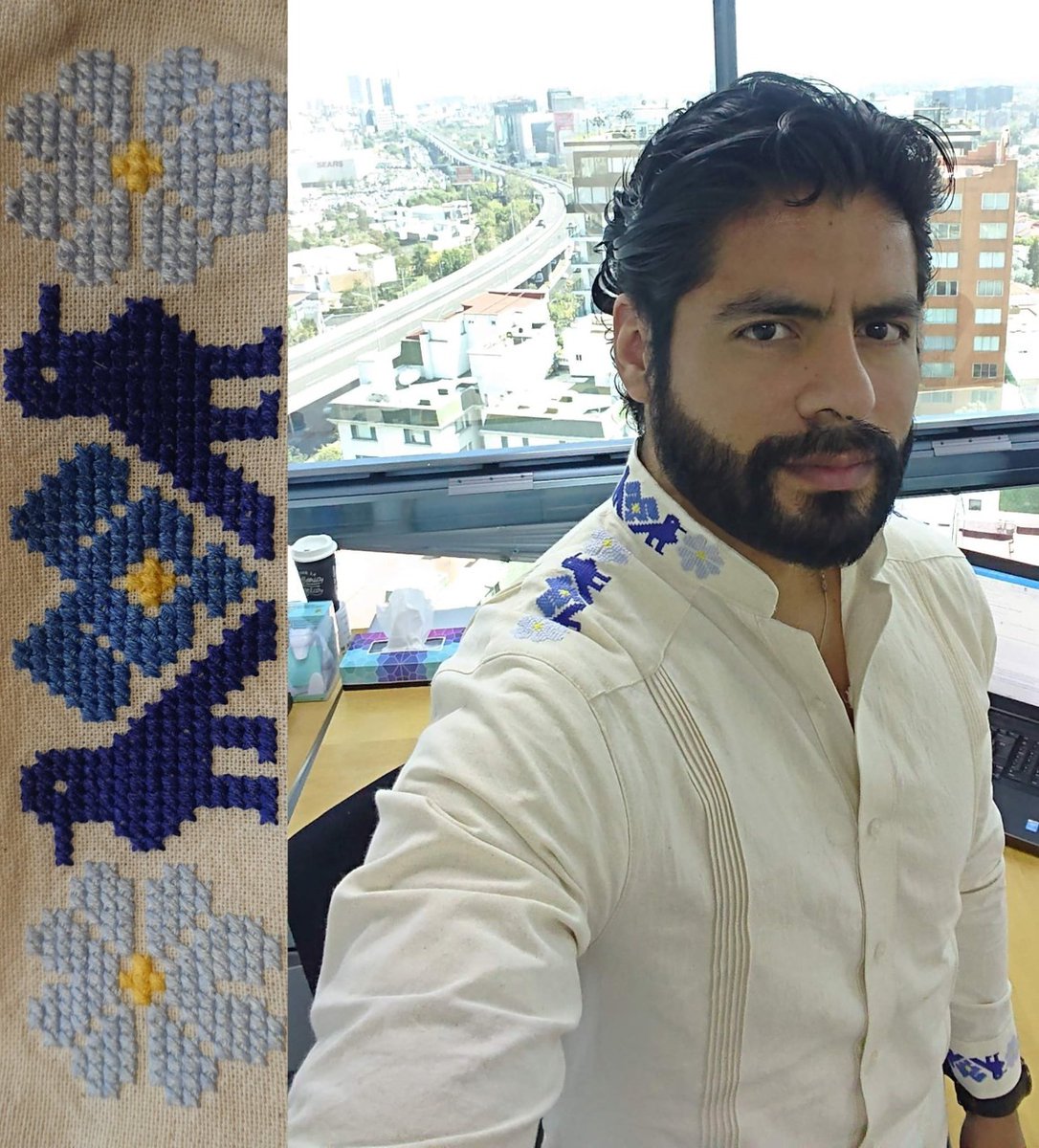 Artesano nahua de Calaco, Veracruz. Borda camisas con el finísimo bordado tradicional de punto de cruz directo sobre manta, plasmando iconografía muy diversa de la Huasteca Veracruzana. facebook.com/bartolome.hern…
