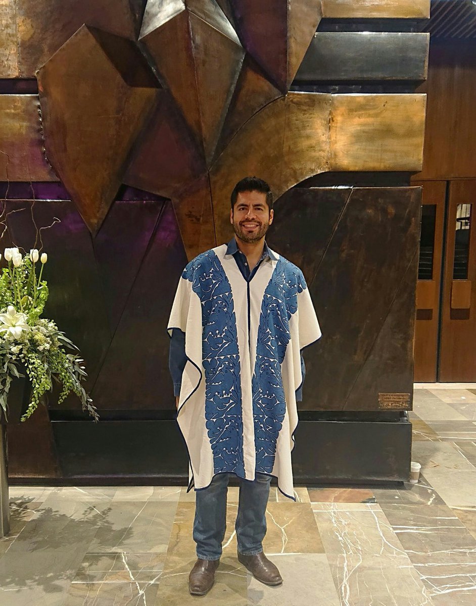 Colectivo de artesanas tsotsiles encabezado por el reconocido tejedor Alberto López, innovan comúnmente con gabanes y otras prendas con brocados tsotsiles para hombres. instagram.com/kuxul_pok/