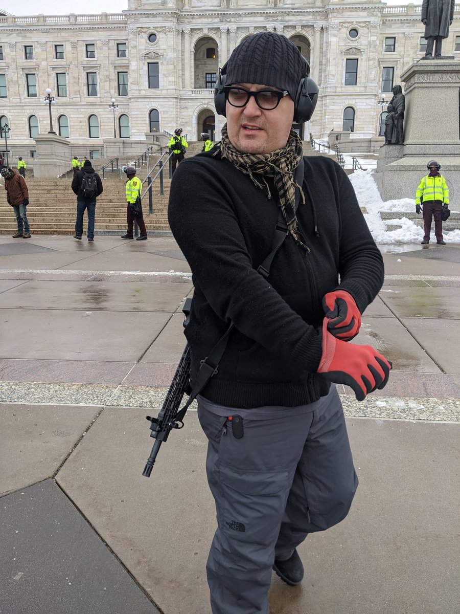 This is Allen, who brought an AR15 bc he heard Antifa was coming. Says he feels silly now with such low turnout. Says he doesn't like Trump; here to tell Walz to reopen MN so he can get back to work.