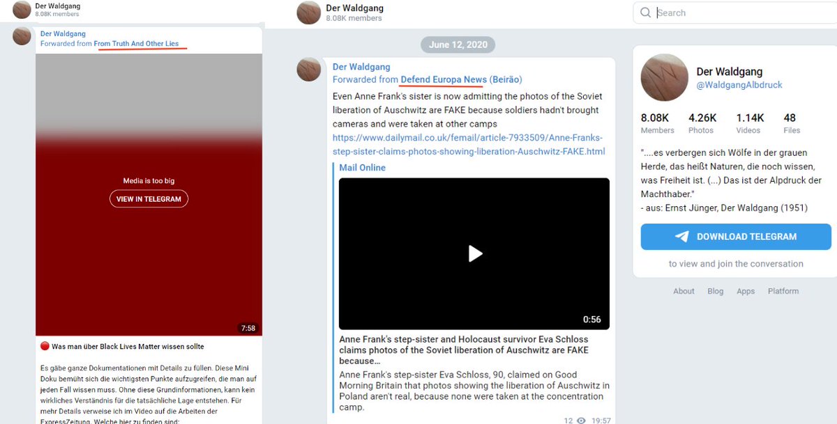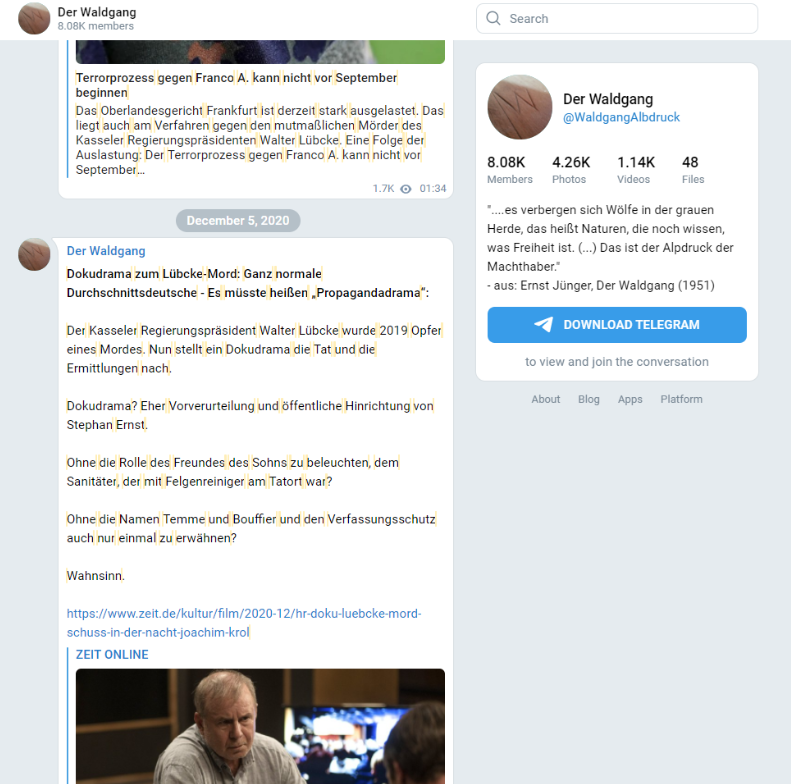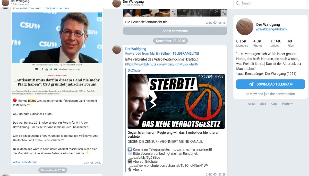 Zurück zu Telegram: Was teilt Brych so? Abgesehen von üblichen Inhalten von Reitschuster, KenFM & Janich teilt er Beiträge von einer Gruppe Namens „Der Waldgang“. #DaveBrych