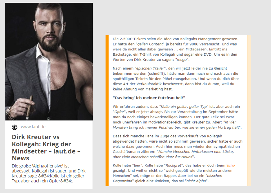 ..plante 2018 mit Rapper Kollegah eine Veranstaltung in der Lanxess-Arena zum Thema Mindset & Erfolg. Die Veranstaltung kam nicht zu Stande, weil Kreuter und Kollegah sich wegen eines Shitstorms ob der horrenden Ticketpreisen überwarfen. #DirkKreuter