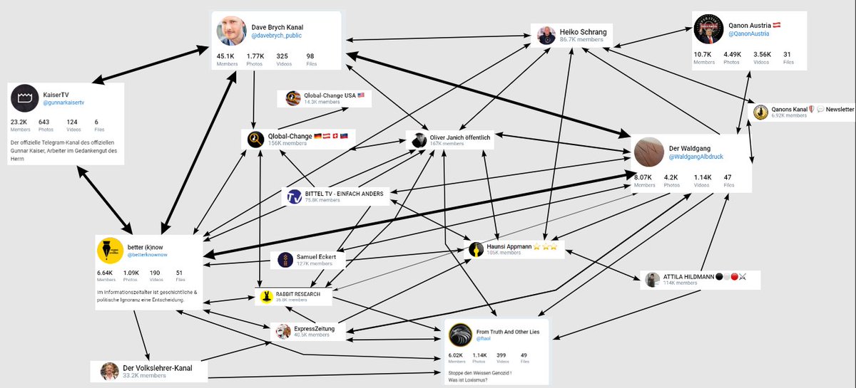 Diese Map veranschaulicht einen größeren Ausschnitt des Netzwerks aus Telegramgruppen, in das Gunnar Kaisers Channel eingebettet ist. #KaiserTV