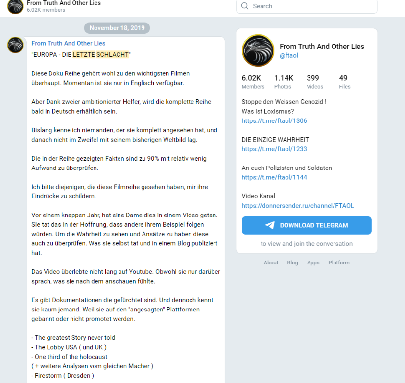 Ein völkisch-nationalistischer Channel, dessen Content aus Fake News, Verschwörungstheorien & rechtsextremer Erkennungssymbolik besteht.