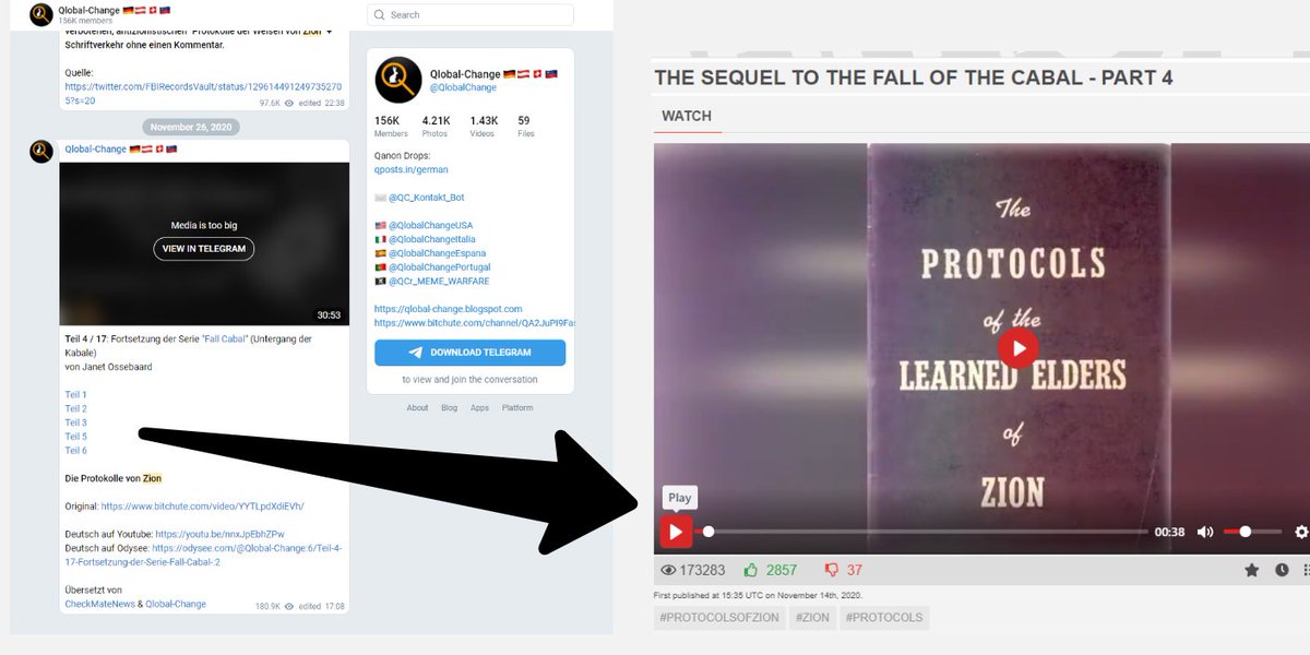 Auch in der Gruppe ‚Qlobal-Change‘ werden solche Videos geteilt, die propagieren, jüdische Menschen seien auf Grund ihrer Herkunft zu bekämpfen.