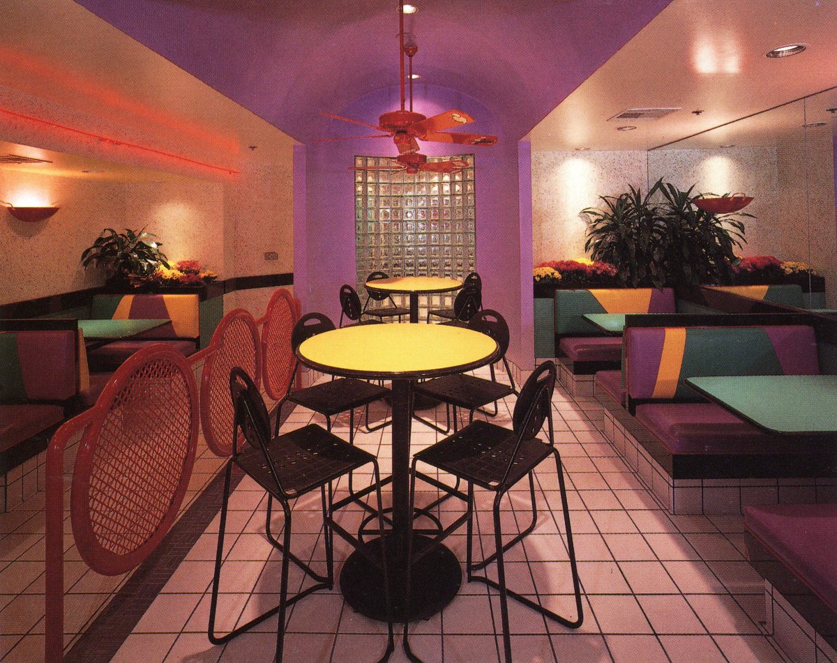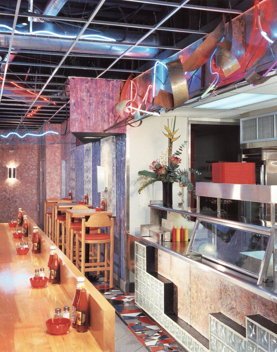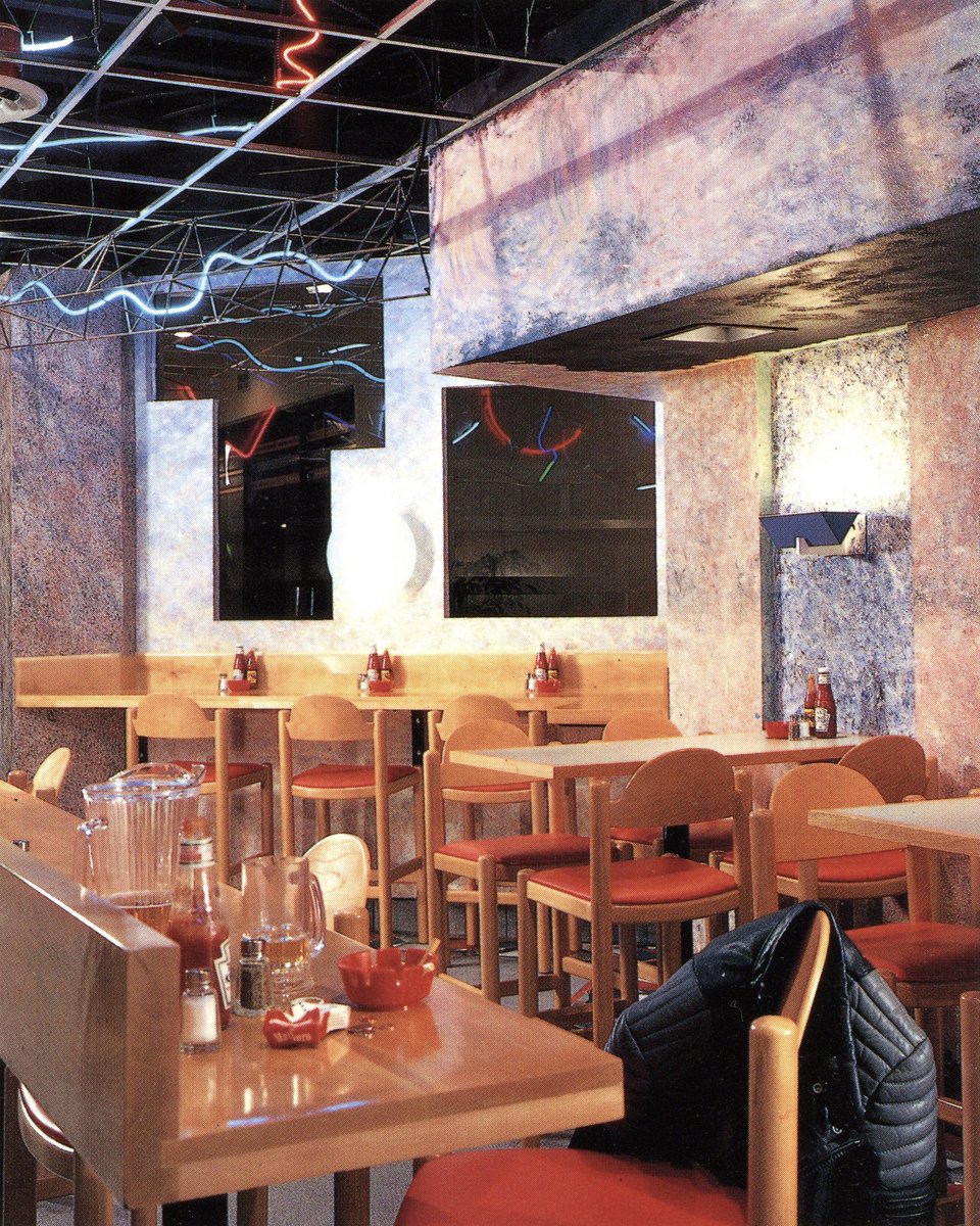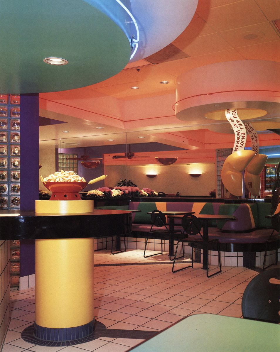 A wild mix of various 1980s design trends: Gehry-ish industrial deconstructivism, Memphis patterns, little bit of diner kitsch