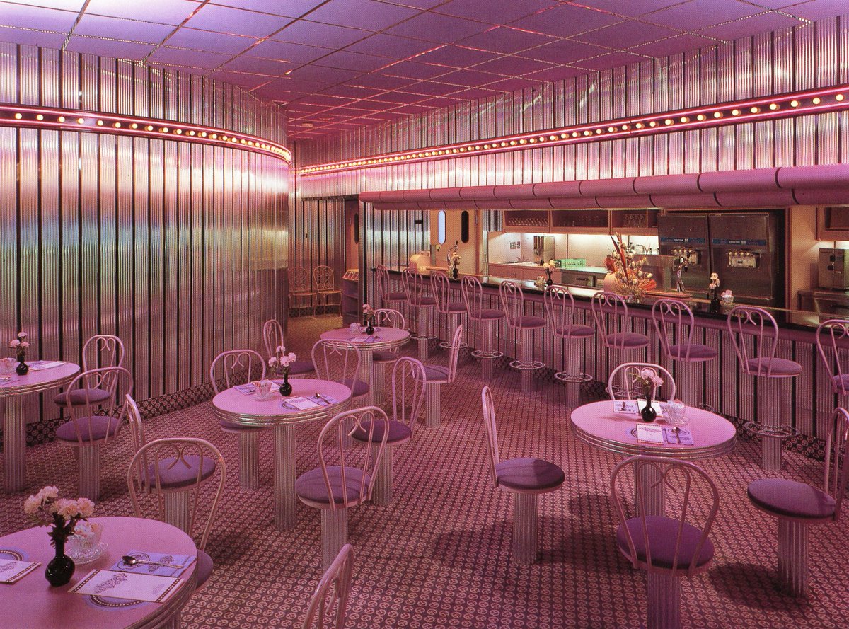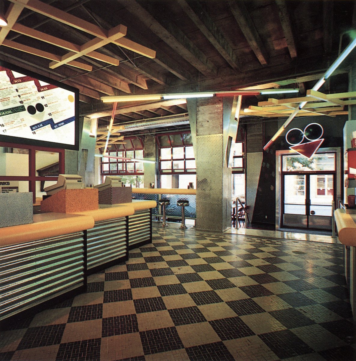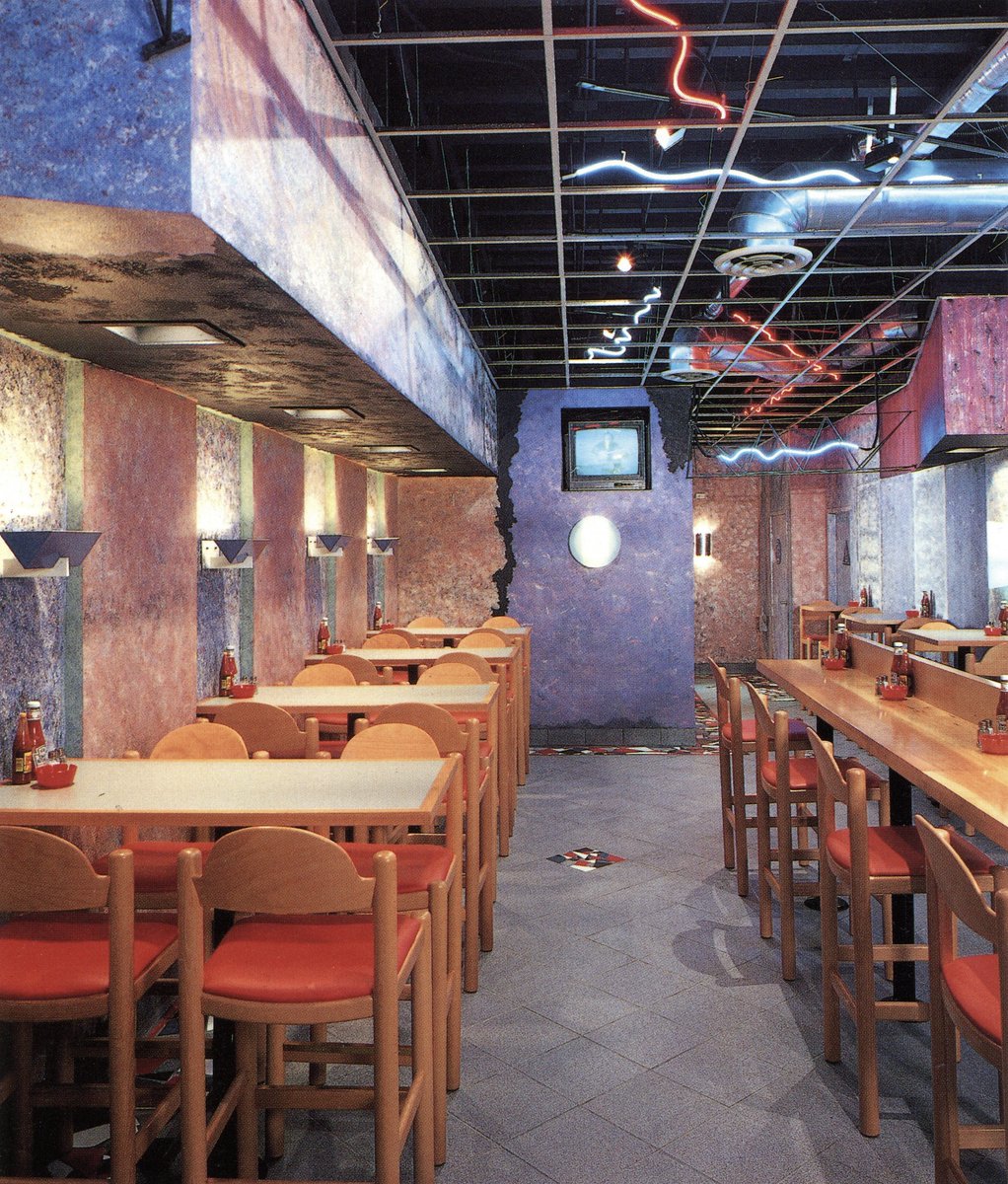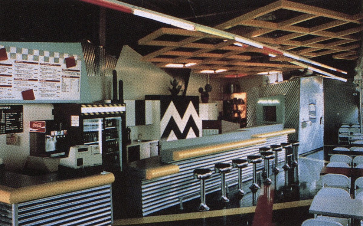A wild mix of various 1980s design trends: Gehry-ish industrial deconstructivism, Memphis patterns, little bit of diner kitsch