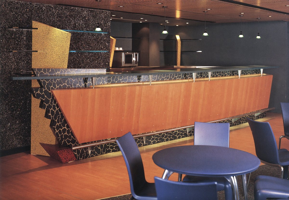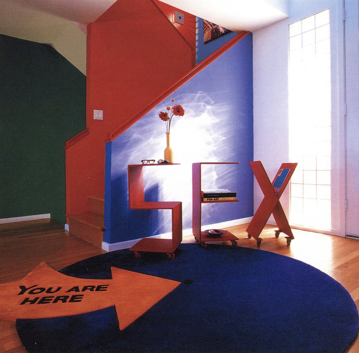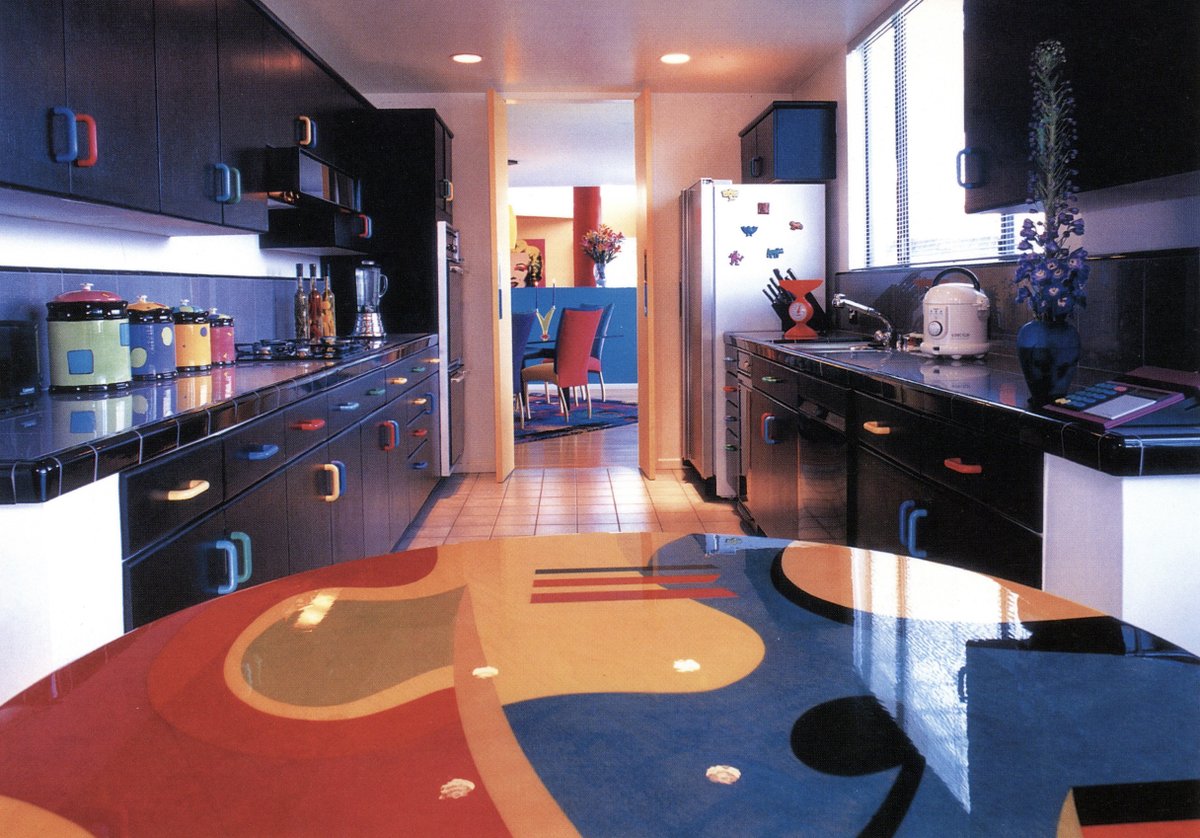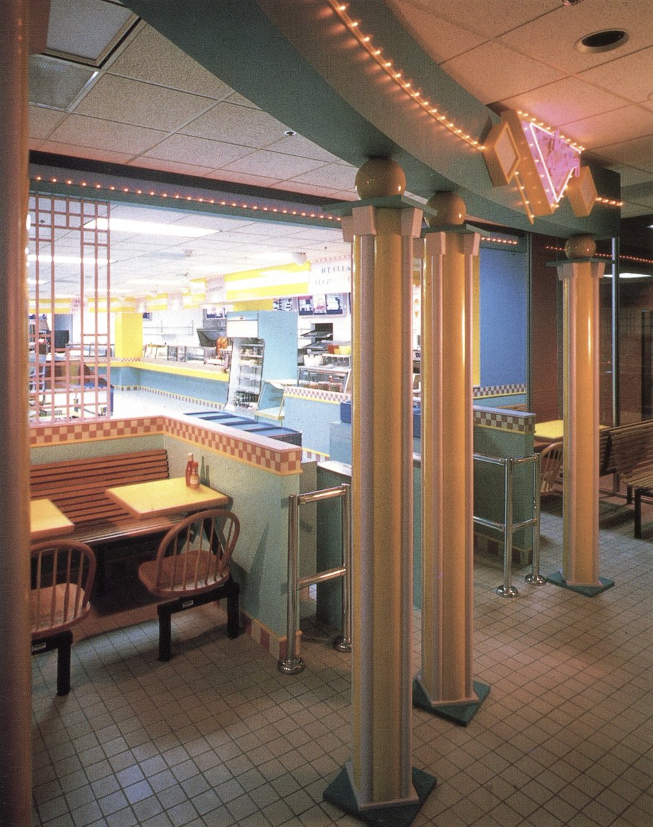 A wild mix of various 1980s design trends: Gehry-ish industrial deconstructivism, Memphis patterns, little bit of diner kitsch