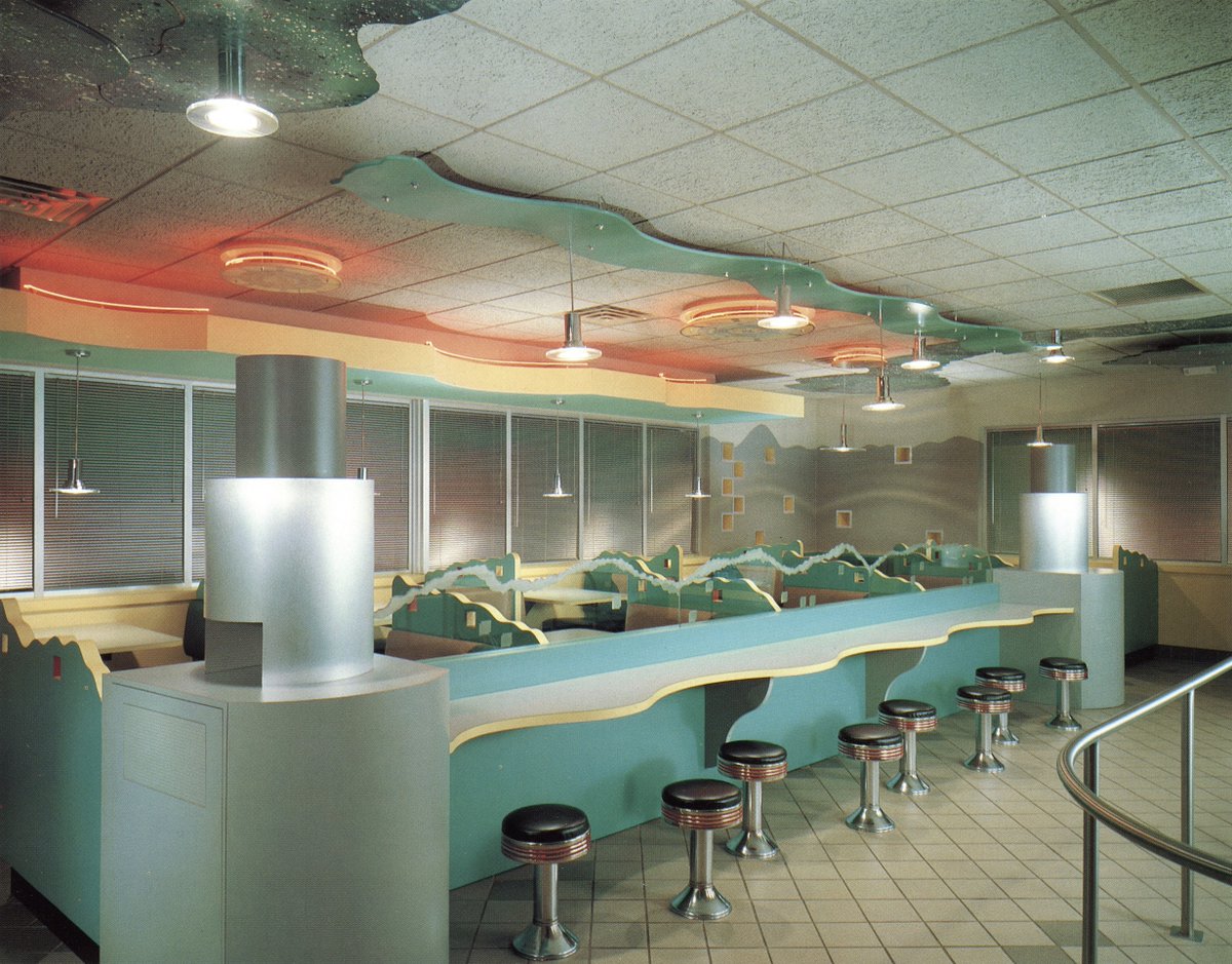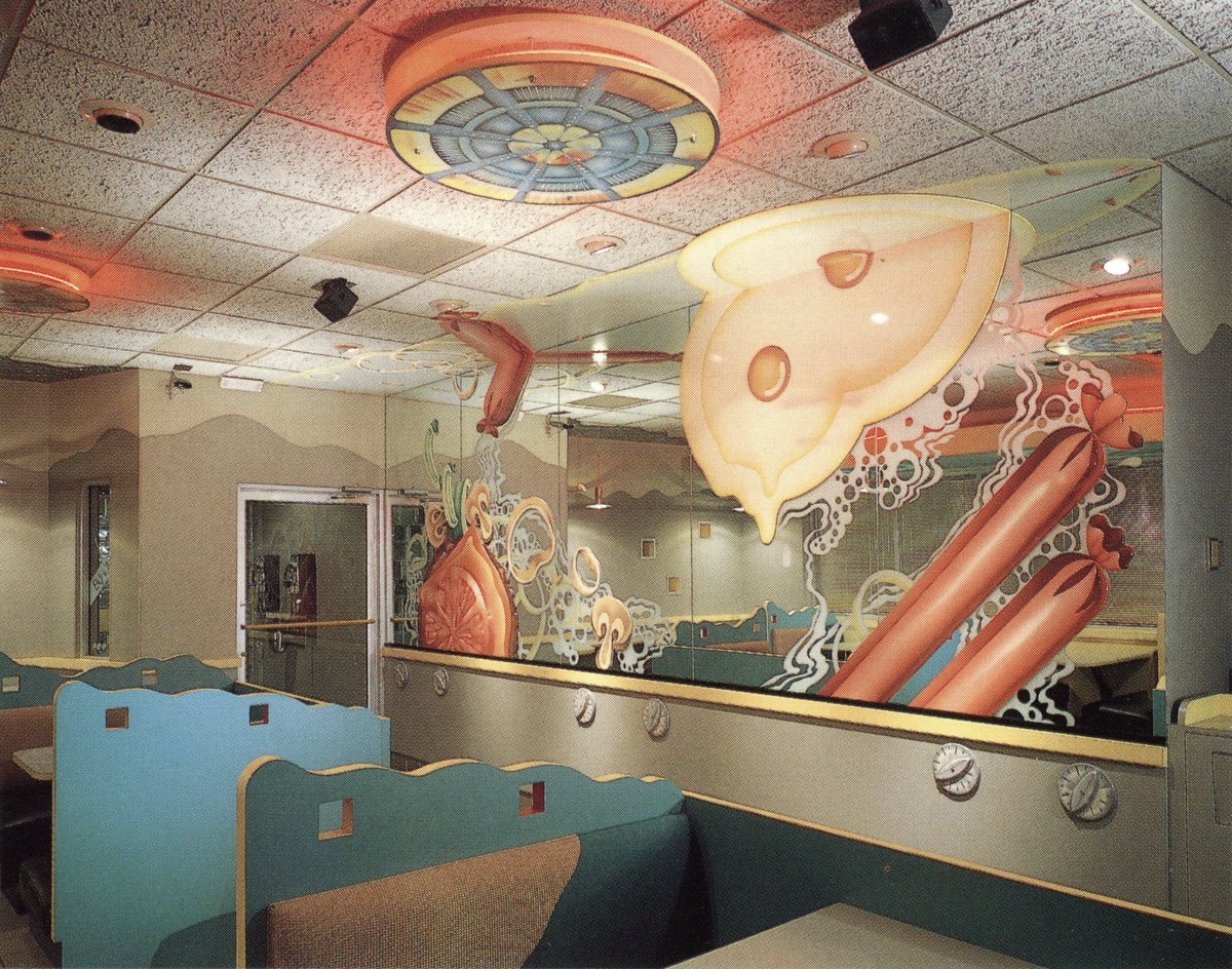 Tied to the 'oversized object Pop Surrealism' trend of the 1970s, this restaurant featured a 20' mirrored glass 'grill' with food cutouts applied to the surface. Also, there's some sort of 'deconstructed burger' design in the 2nd image.