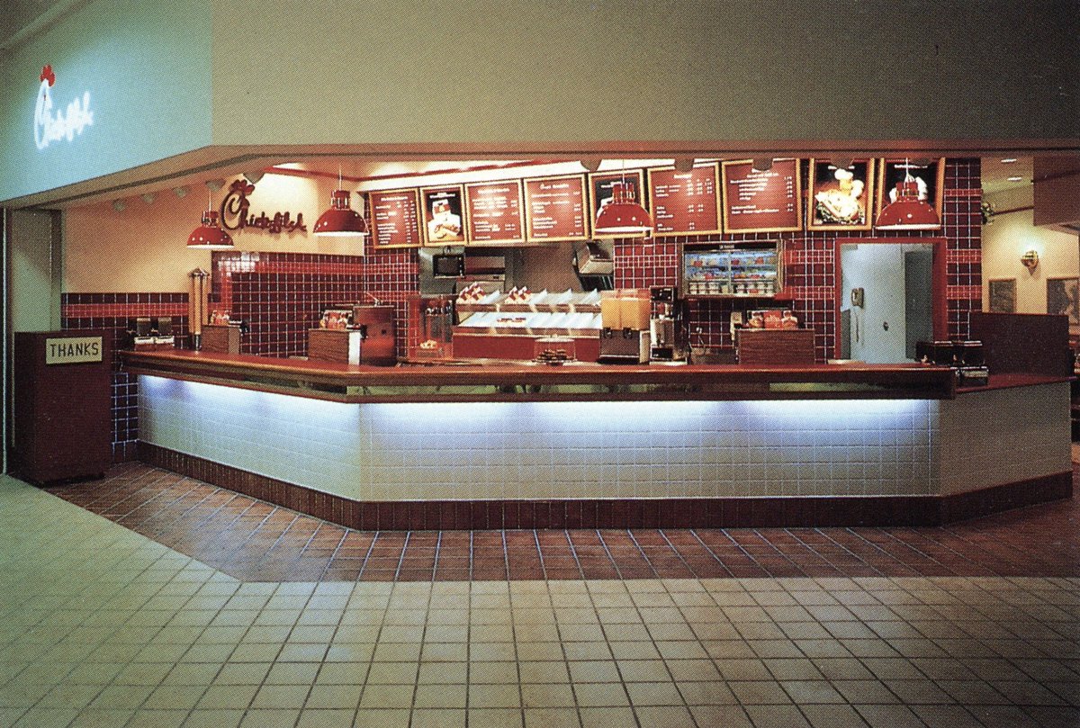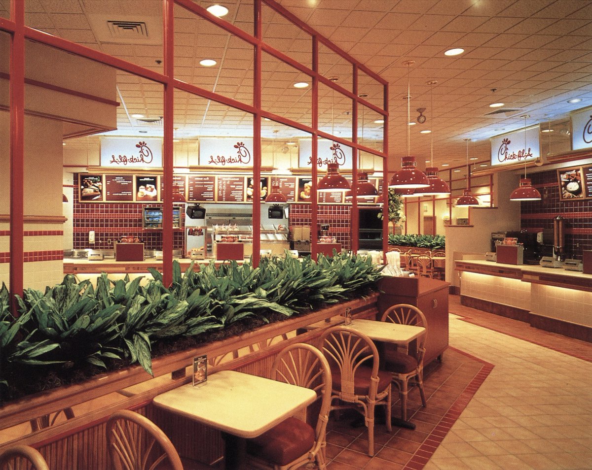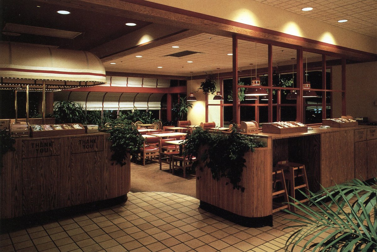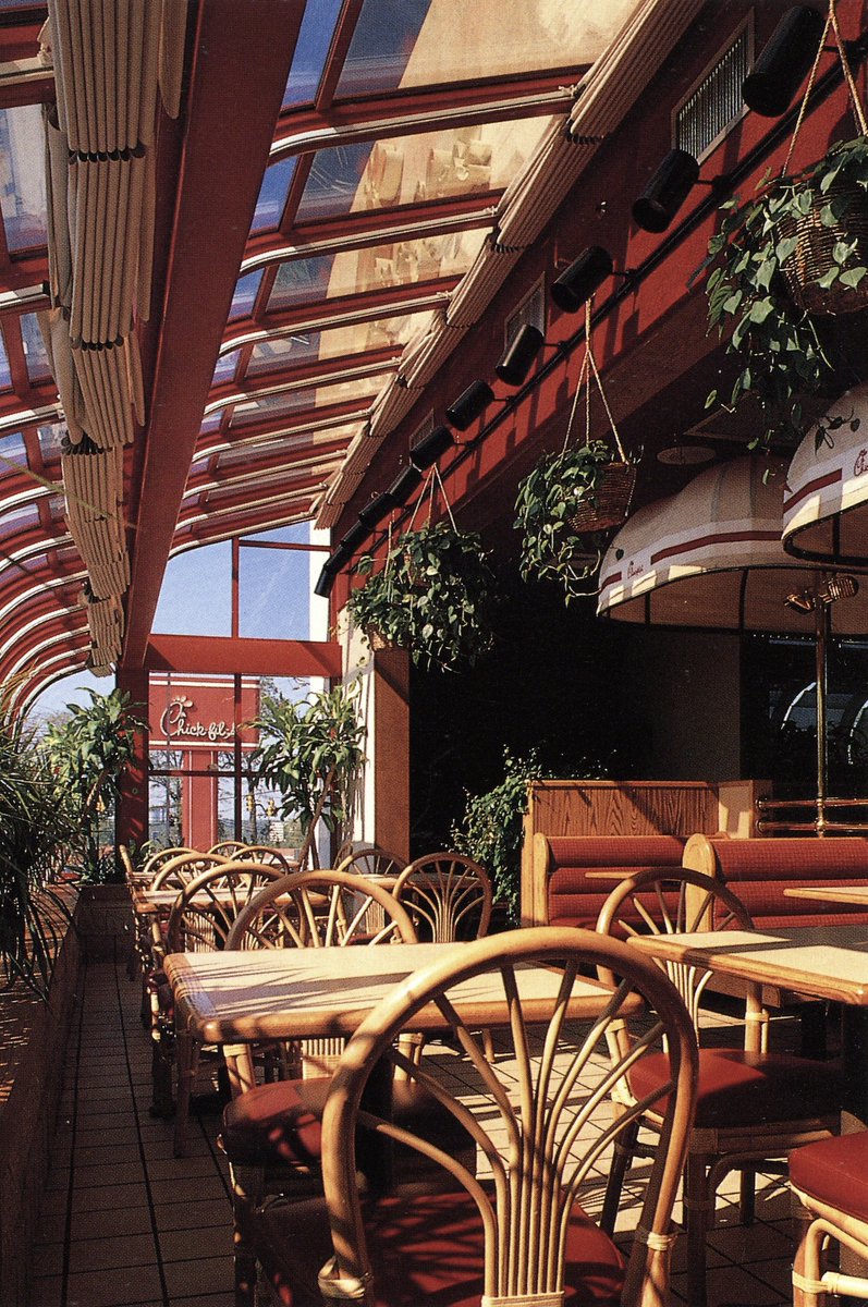 This one's interesting, a Chic-Fil-A prototype restaurant that I assume didn't take off. It has the popular 'garden solarium' design seen in Wendy's restaurants, and some leftovers from both the 'Gay Nineties' (1890s) revival style & the 70s 'Eco-Shed' environmental look.