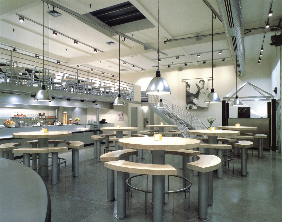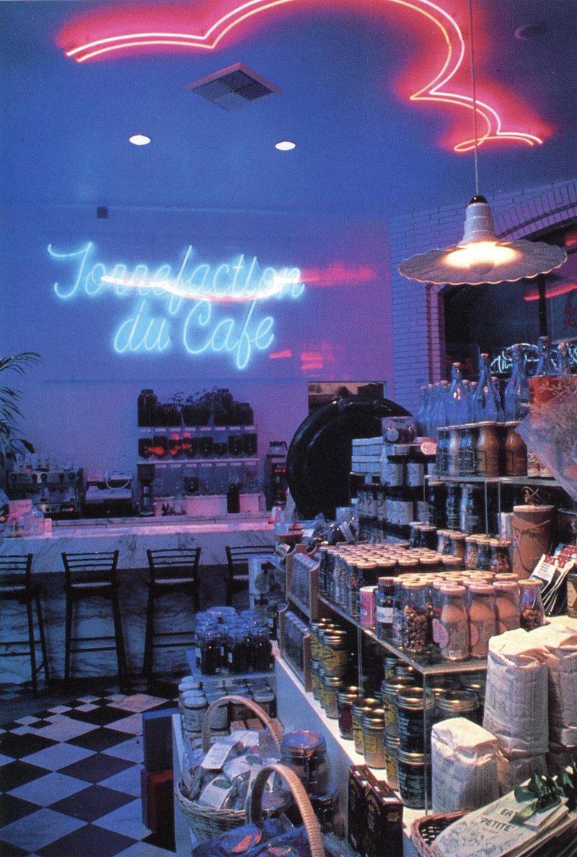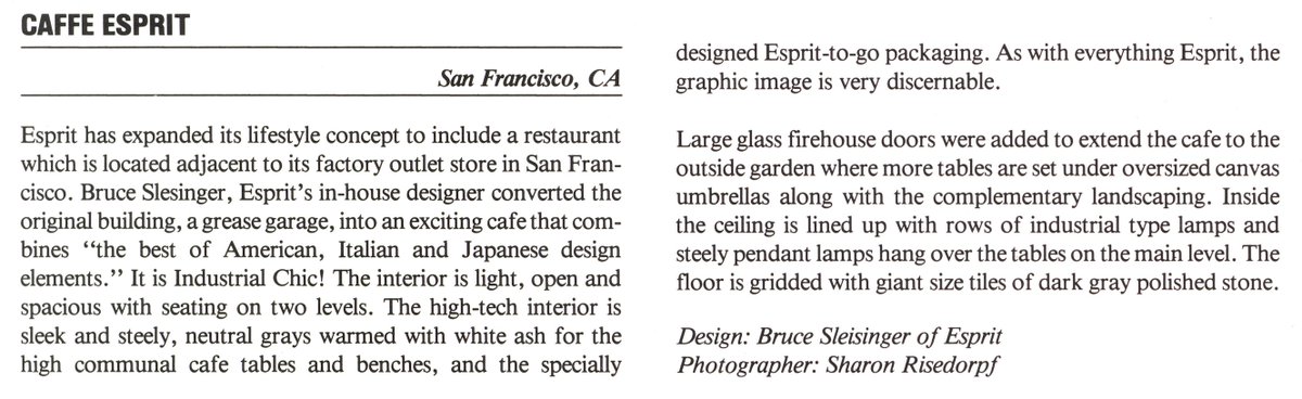And now for something totally different: 'Caffe Esprit' in San Francisco. Esprit definitely had some of the best branding design of the 1980s, and their restaurant feels quite ahead of its time, super minimal and industrial