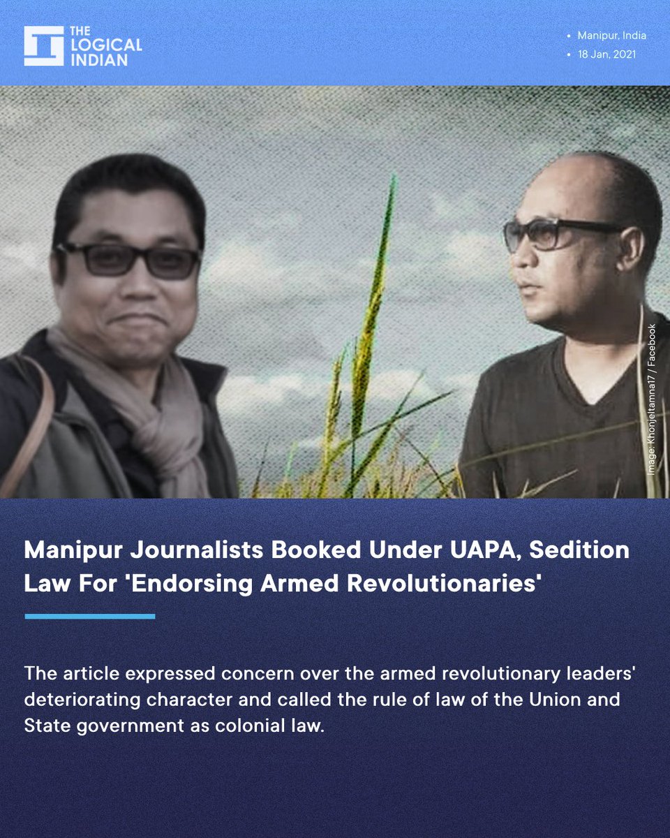The Manipur Police have booked The Frontier Manipur Executive Editor Paojel Chaoba and Editor-In-Chief Dhiren Sadokpam under the Unlawful Activities Prevention Act (#UAPA), over an article criticising the state's militancy movement and the Union government.